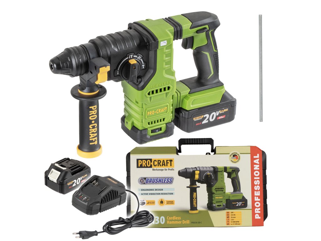 Aku vŕtacie kladivo Procraft PHA30bb je výkonné a spoľahlivé náradie ideálne na stavebné, montážne a renovačné práce. Vďaka bezuhlíkovému motoru, režimom vŕtania, vŕtaniu s príklepom a koseniu poskytuje vysokú flexibilitu a výkon.
