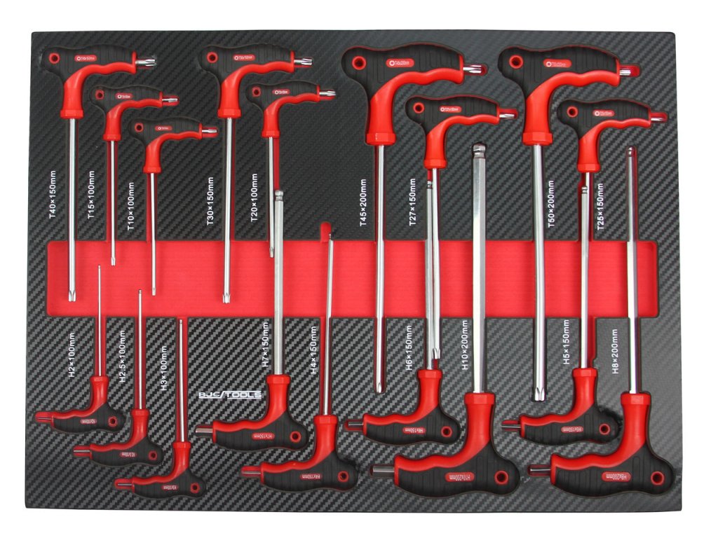 - Sada imbusových kľúčov 18 ks typ T: 2*100, 2.5*100, 3*100, 4*150, 4.5*150, 5*150, 6*150, 8 *200, 10*200, T10*100, T15*100, T20*100, T25*150, T27*150, T30*150, T40*150, T45*200, T50*200