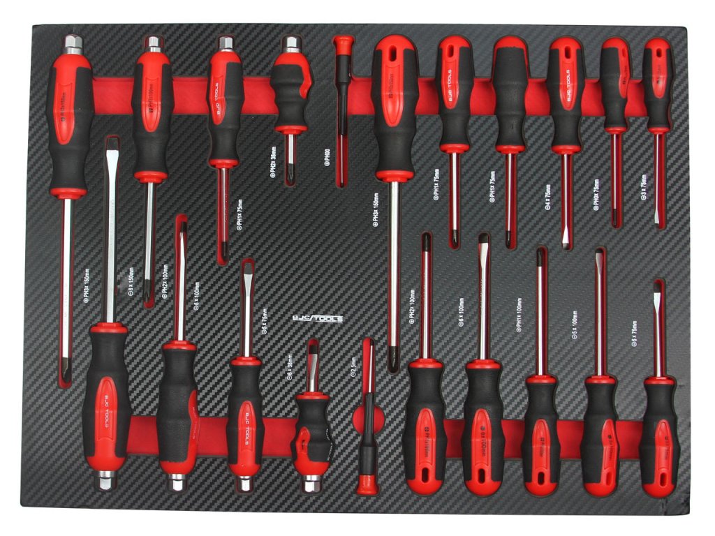 - Sada plochých a krížových skrutkovačov: PH 3x150 MM, 8x150 MM, PH 2X100 MM, 6x100 MM, PH 1x75 MM, 5x 75 MM, PH 2x38 MM, 6x38 MM, 2.5 MM, 2.5MM, PH 3x150 MM, PH 2x100 MM, 5x75 MM, 6x100 MM, PH 1x75 MM, PH 1x100 MM, 4x75 MM, 5x100 MM, PH 0x75 MM, PH 1x75 MM, 3x75 MM