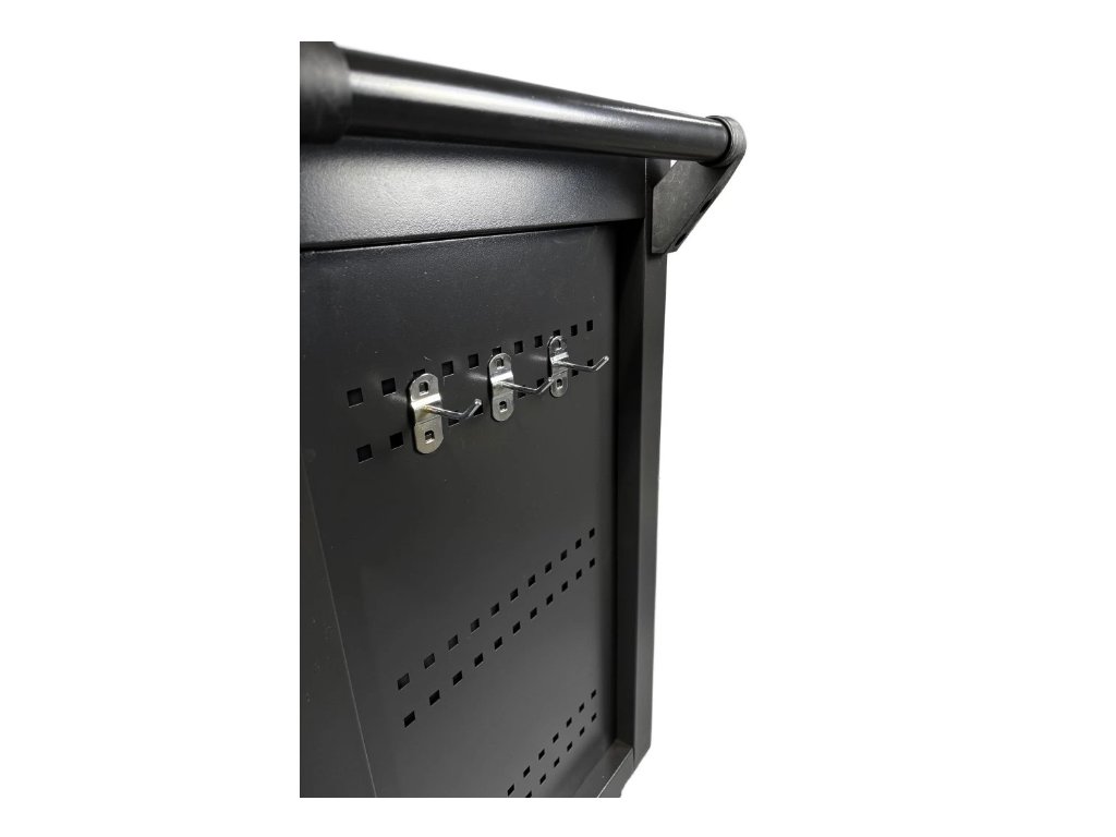 - Na bočnej strane vozíka sa nachádzajú praktické háčiky na zavesenie často používaného náradia.