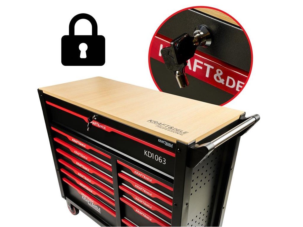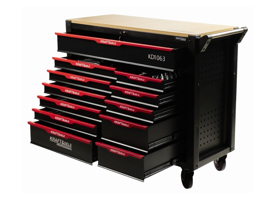 - Profesionálny dielenský vozík s 12 zásuvkami na guľôčkových ložiskách, s hornou zásuvkou určenou pre použitie v špecializovanom servise.