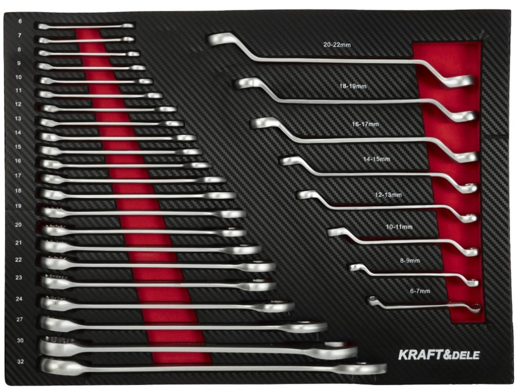 - 8 ohnutých očkových kľúčov – 6*7mm, 8*9mm, 10*11mm, 12*13mm, 14*15mm, 16*17mm, 18*19mm, 20*22mm,