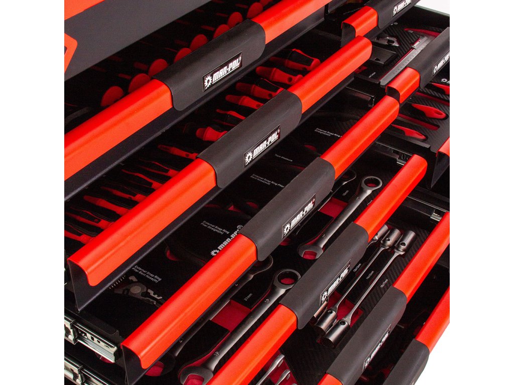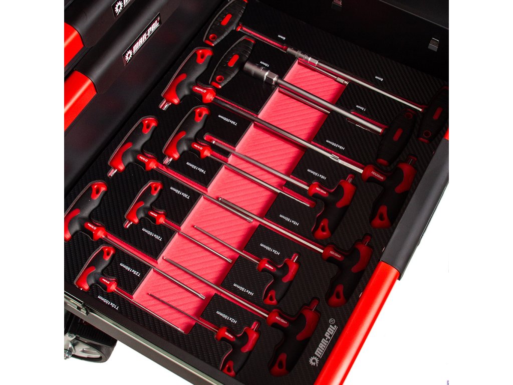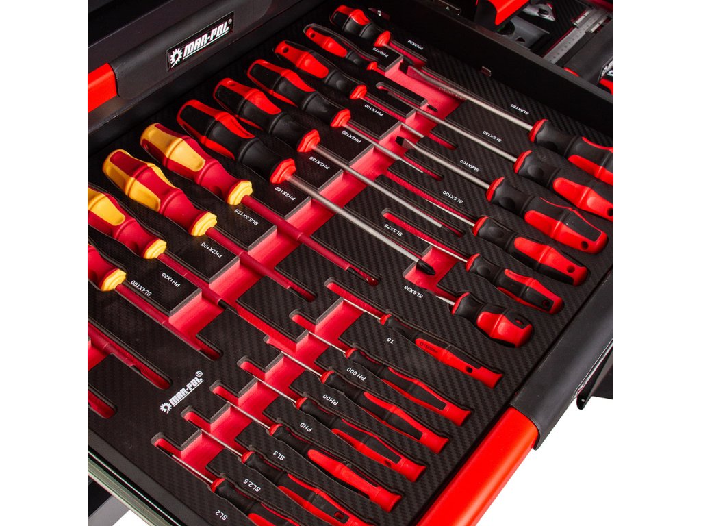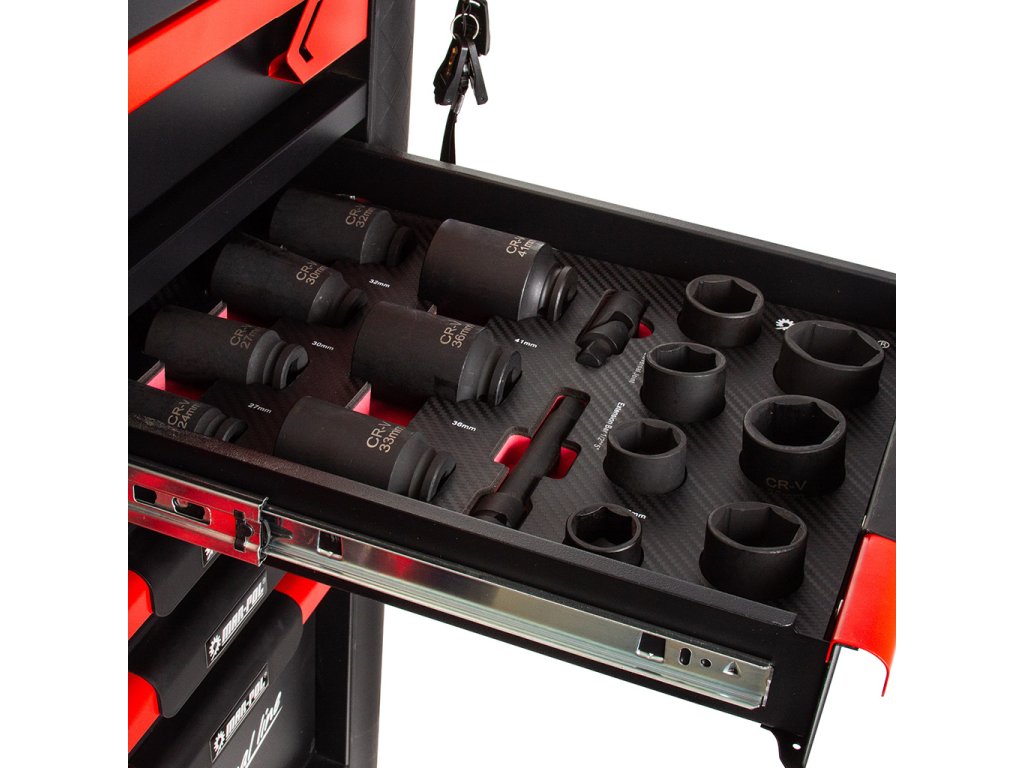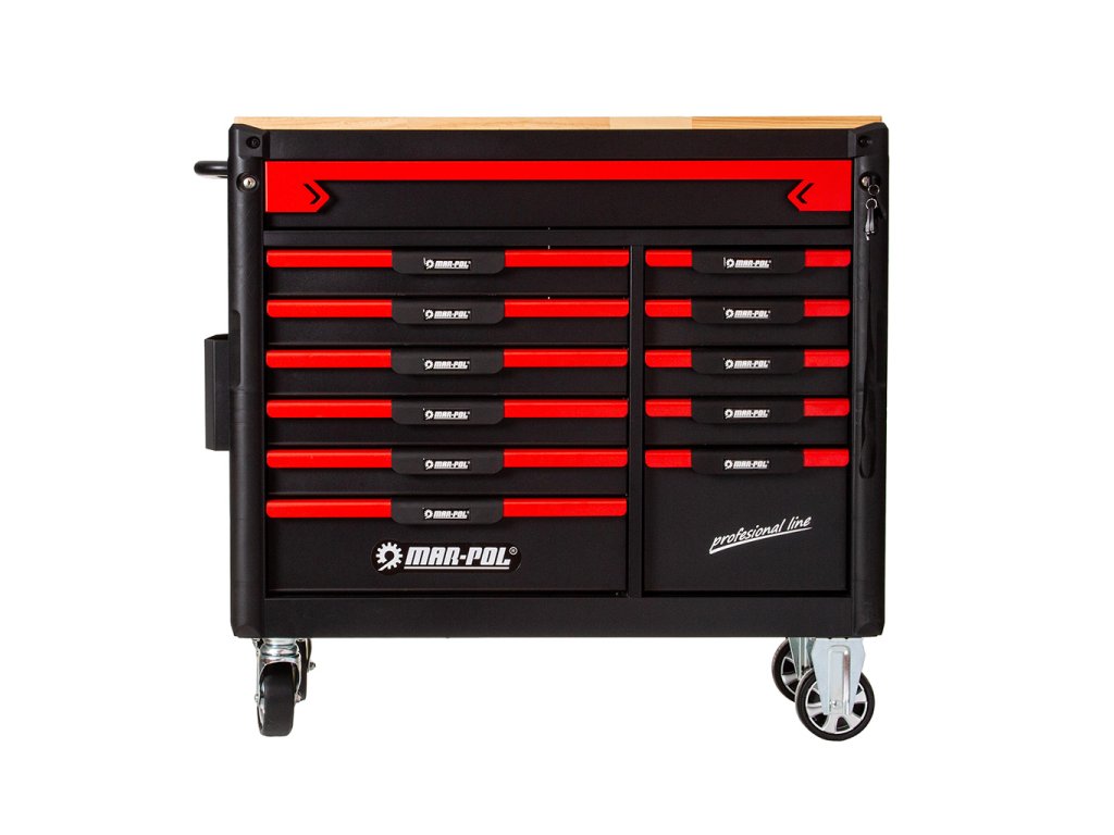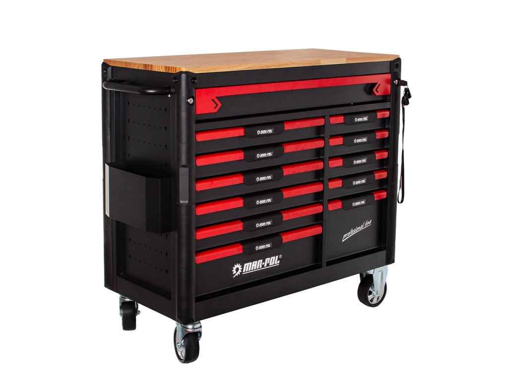 - Profesionálny dielenský vozík s 12 zásuvkami na guľôčkových ložiskách, s hornou zásuvkou určenou pre použitie v špecializovanom servise.