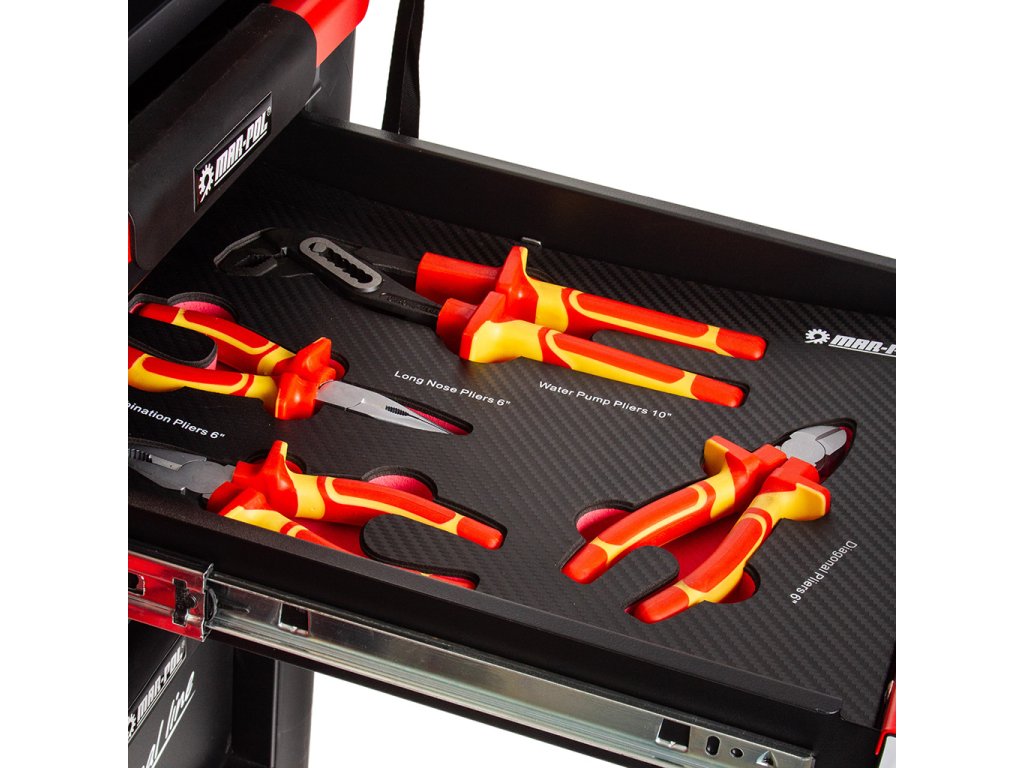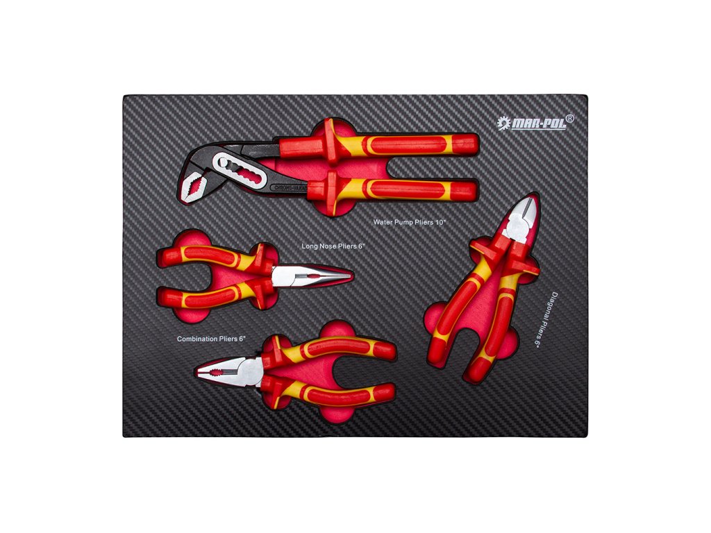 4 ks - izolované kliešte diagonálne 6", kliešte s dlhou čeľusťou 6", kombinované kliešte 6", kľúč nastaviteľný 10".