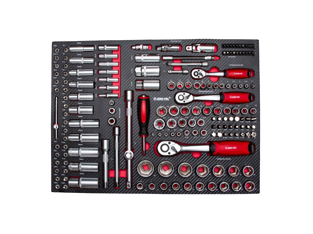 - 1/2" objímky (17 kusov): 10; 11; 12; 13; 14; 15; 16; 17; 18; 19; 20; 21; 22; 24; 27; 30; 32; mm