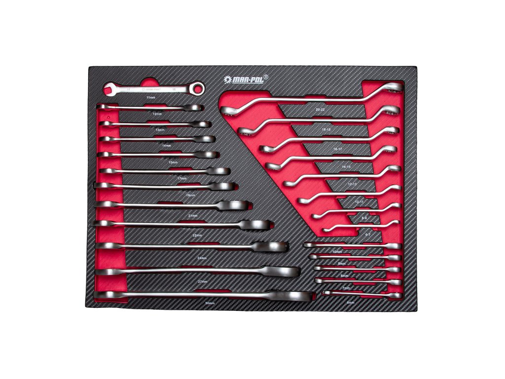 - 8 ohnutých očkových kľúčov – 6x7-8x9-10x11-12x13-14x15-16x17-18x19-20x22