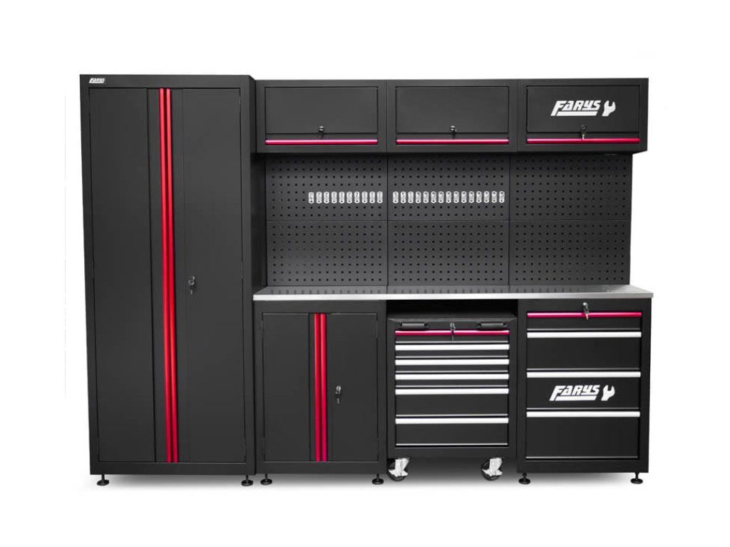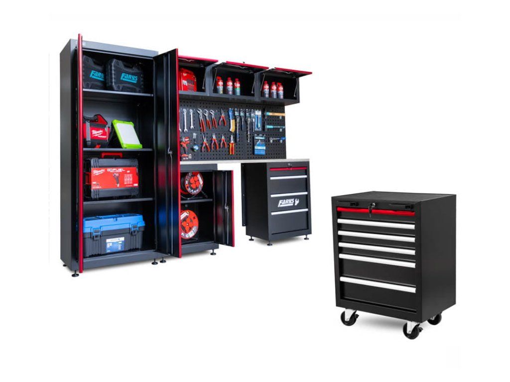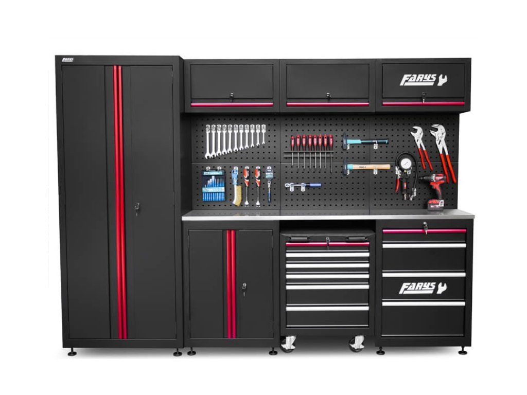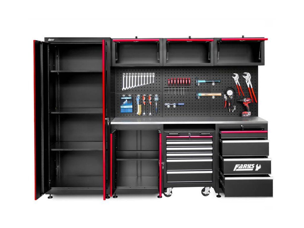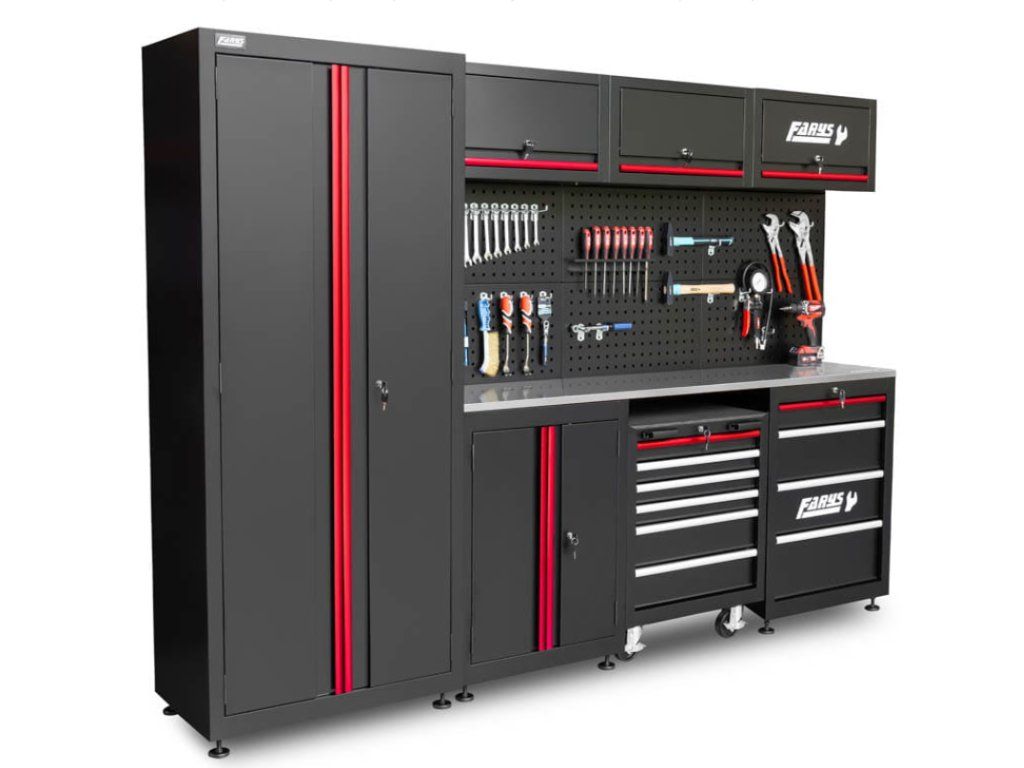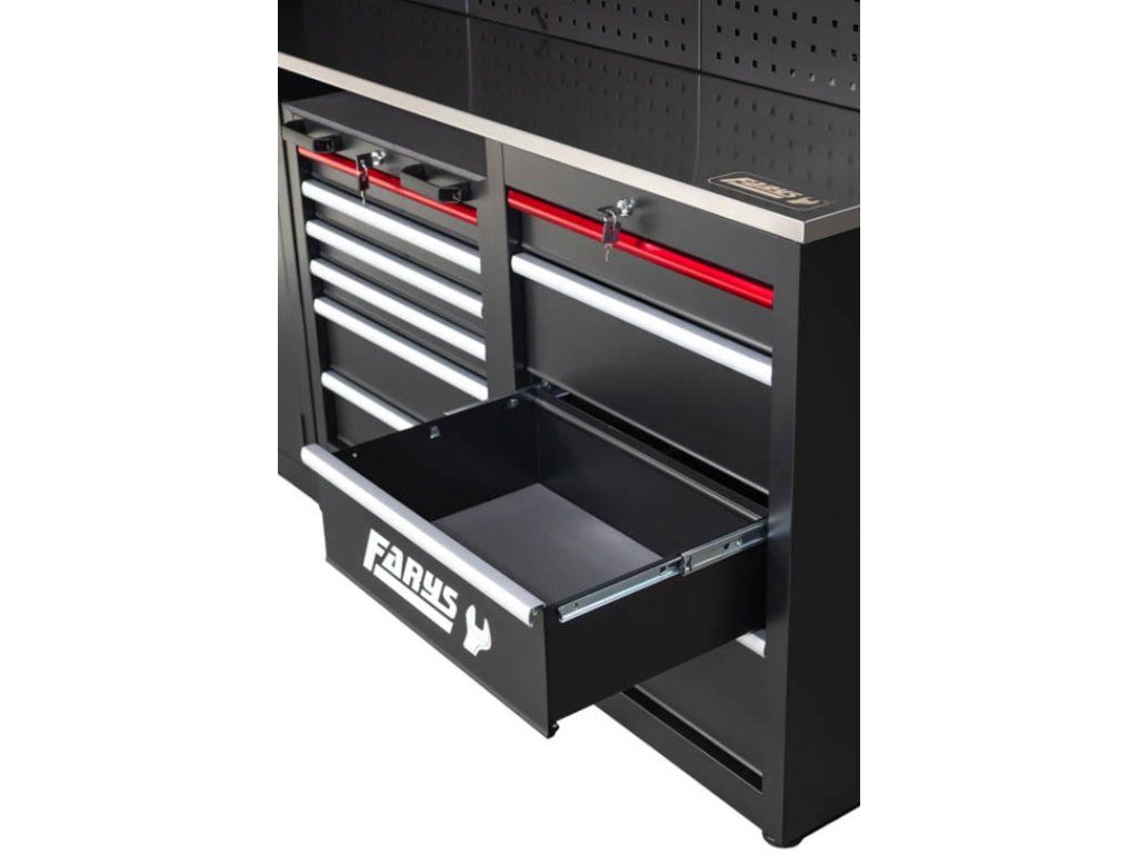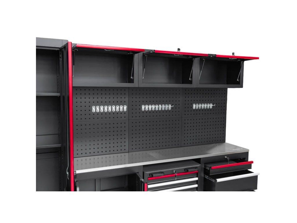 Zostava ponúka dostatok úložného priestoru v podobe skriniek, zásuviek a políc, vďaka čomu budete mať svoje náradie vždy prehľadne usporiadané.