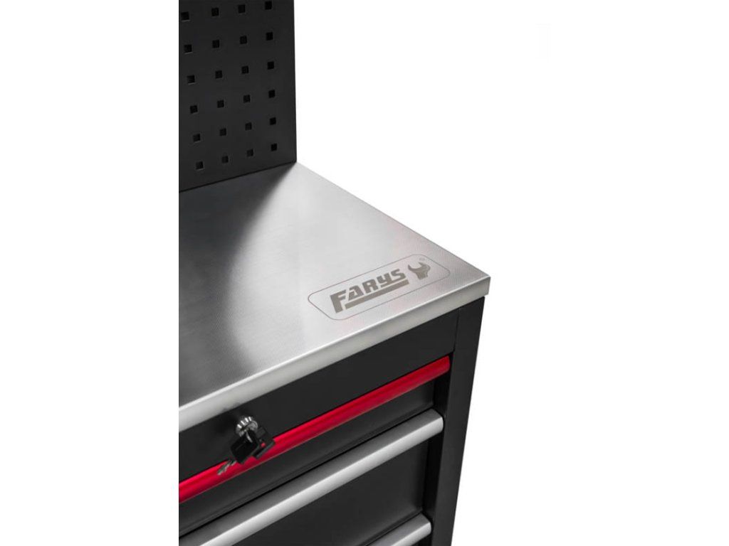 Všetky skrinky sú zabezpečené zámkami a kvalitná drevená pracovná doska umožňuje pripevnenie napríklad zveráka, čím poskytuje pohodlné a stabilné pracovisko.