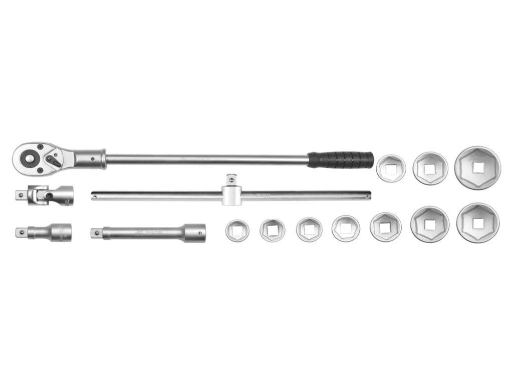 Súprava obsahuje celkom 15 dielov, medzi ktorými sú nástrčné hlavice, predlžovacie nadstavce, univerzálny kardanový kĺb, račňa a T-vratidlo. Račňa s dĺžkou 500 mm a mechanizmom s 24 zubami je vhodná na efektívnu prácu aj pri vyššom zaťažení. Súčasťou balenia sú aj predĺženia s dĺžkou 100 mm a 200 mm, ktoré uľahčujú prístup k menej dostupným miestam.