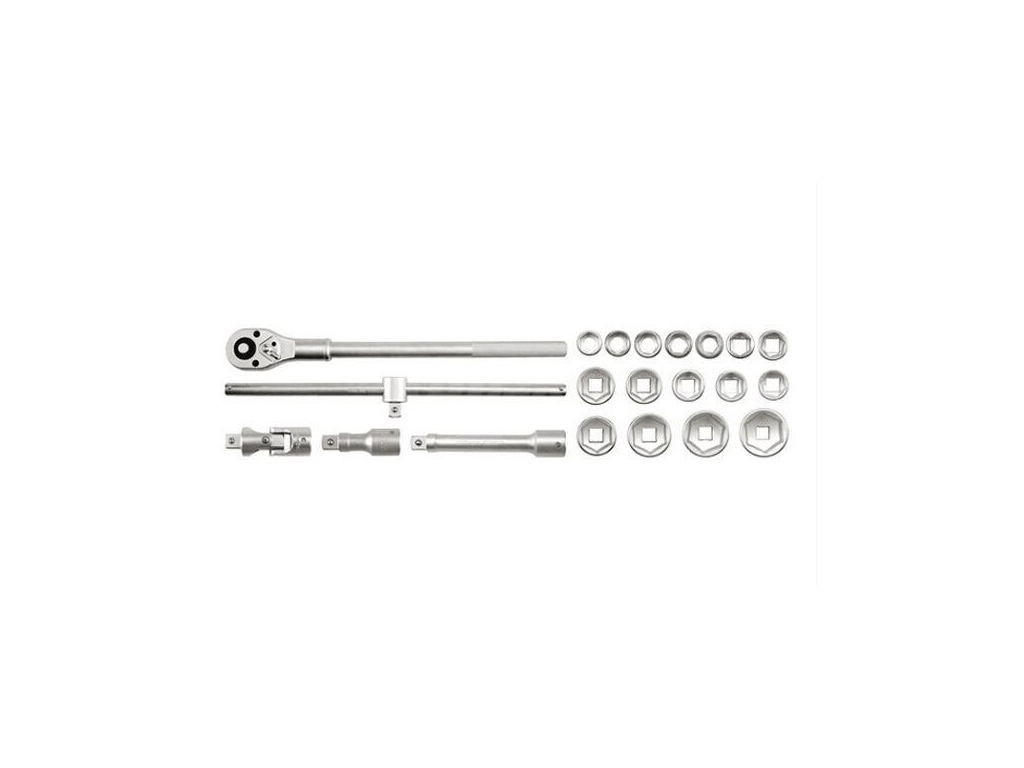 Súprava obsahuje 21 dielov a podľa výrobcu zahŕňa račňu, nástrčné hlavice 19–50 mm, kĺbové a predlžovacie adaptéry aj T-vratidlo. Sada je vyrobená z materiálov CrV 50BV30 a CrV 6140 a dodáva sa v praktickom boxe na prehľadné uloženie náradia.
