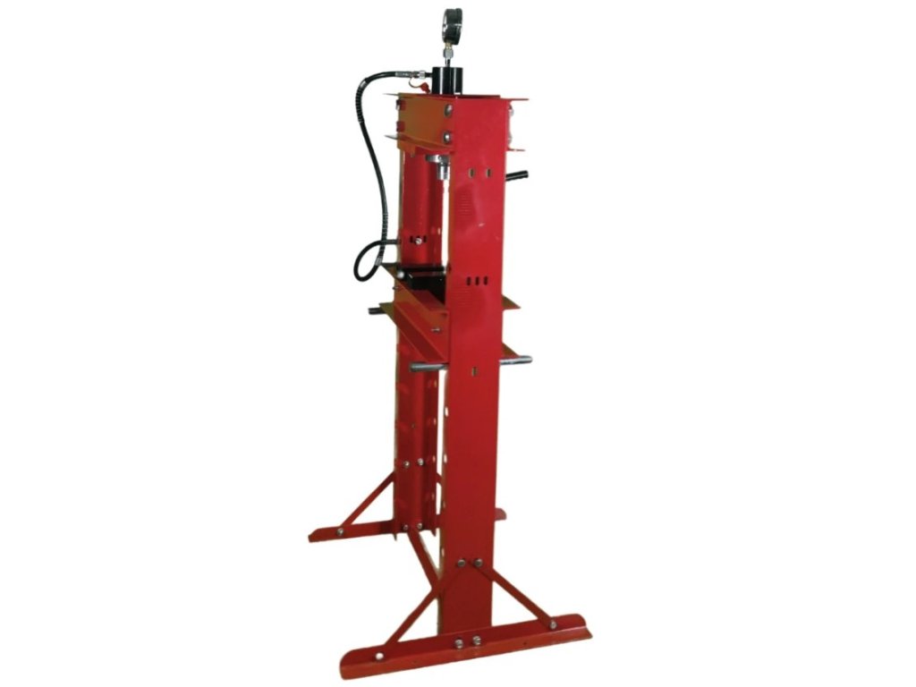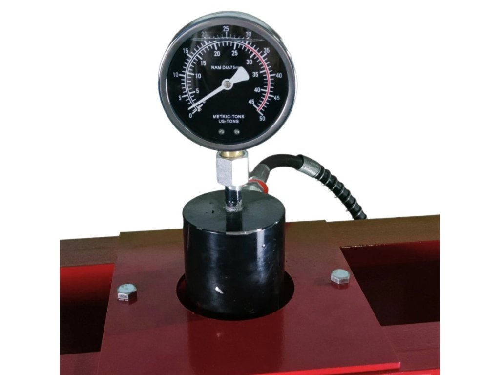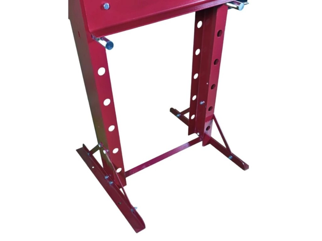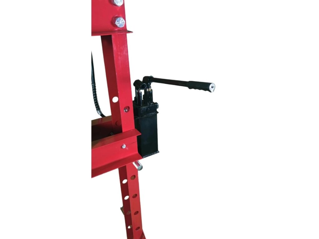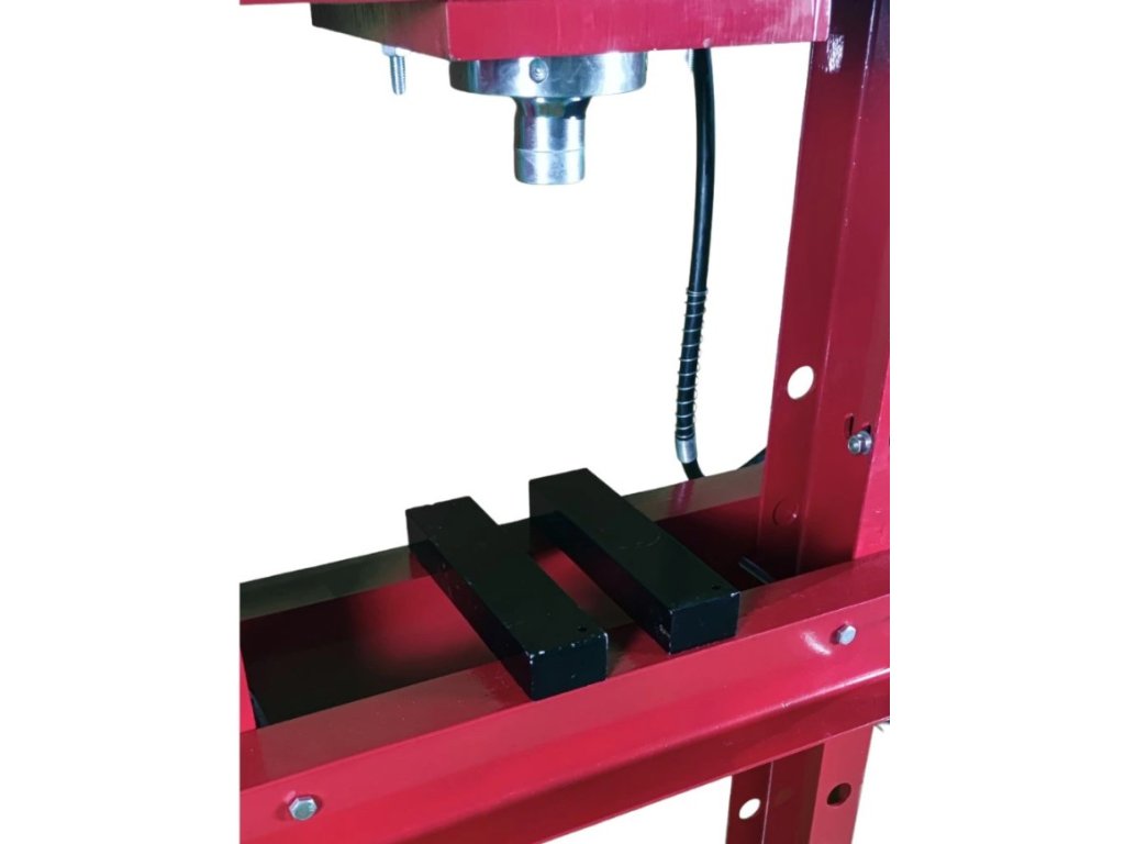 Zariadenie má 6-stupňové nastavenie pracovnej polohy , čo znamená, že sme schopní ľahko a rýchlo zmeniť jeho výšku a prispôsobiť lis aktuálnym úlohám. Správne profilovaná pracovná polica a dve masívne liatinové dosky umožňujú presné vedenie piesta počas prevádzky a správnu podporu lisovaného prvku. Po odskrutkovaní ventilu na valci sa piest automaticky vráti do východiskovej polohy.