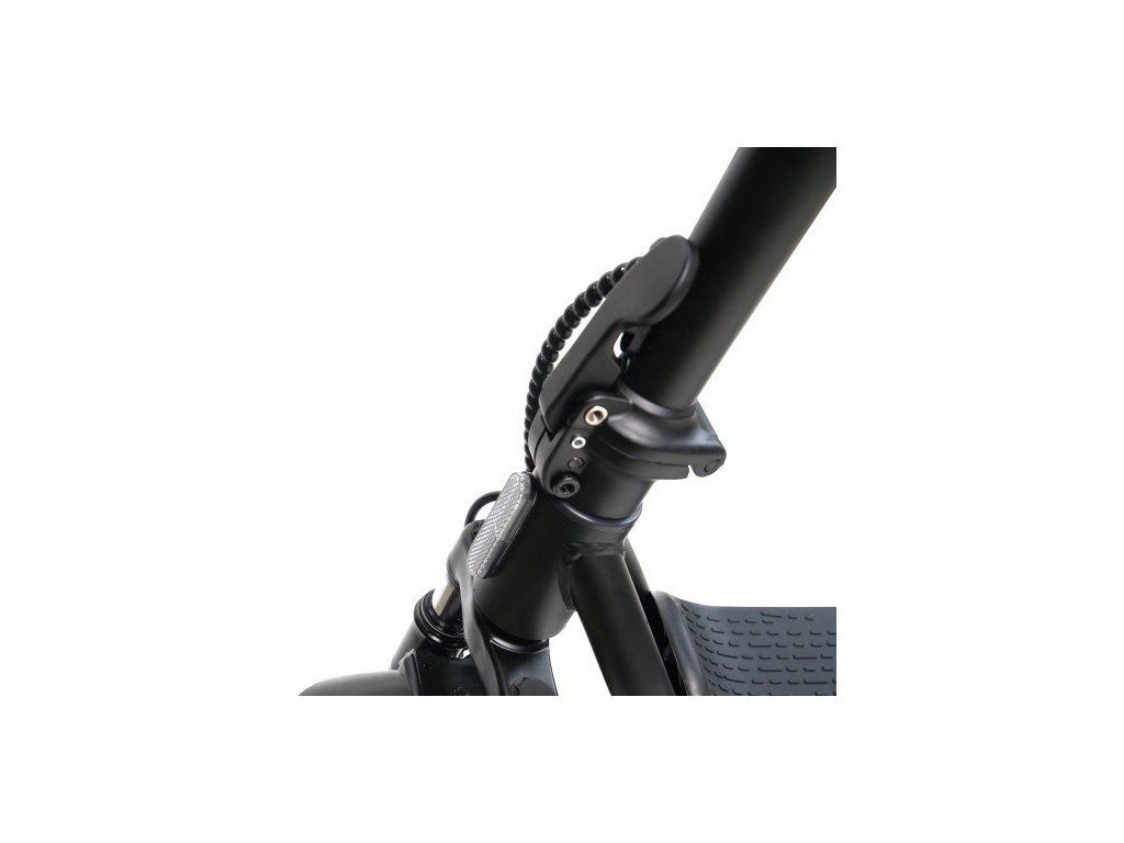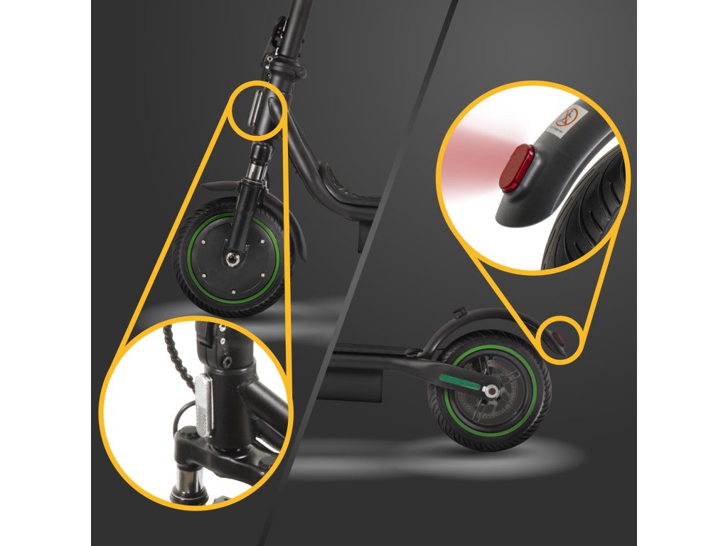 Elektrokolobežka je vybavená tlmičom nárazov prednej vidlice, ktorý tlmí nárazy a zvyšuje komfort jazdy aj na nerovnom povrchu. 8,5“ bezdušové pneumatiky znižujú riziko prepichnutia a prispievajú k stabilnej jazde.