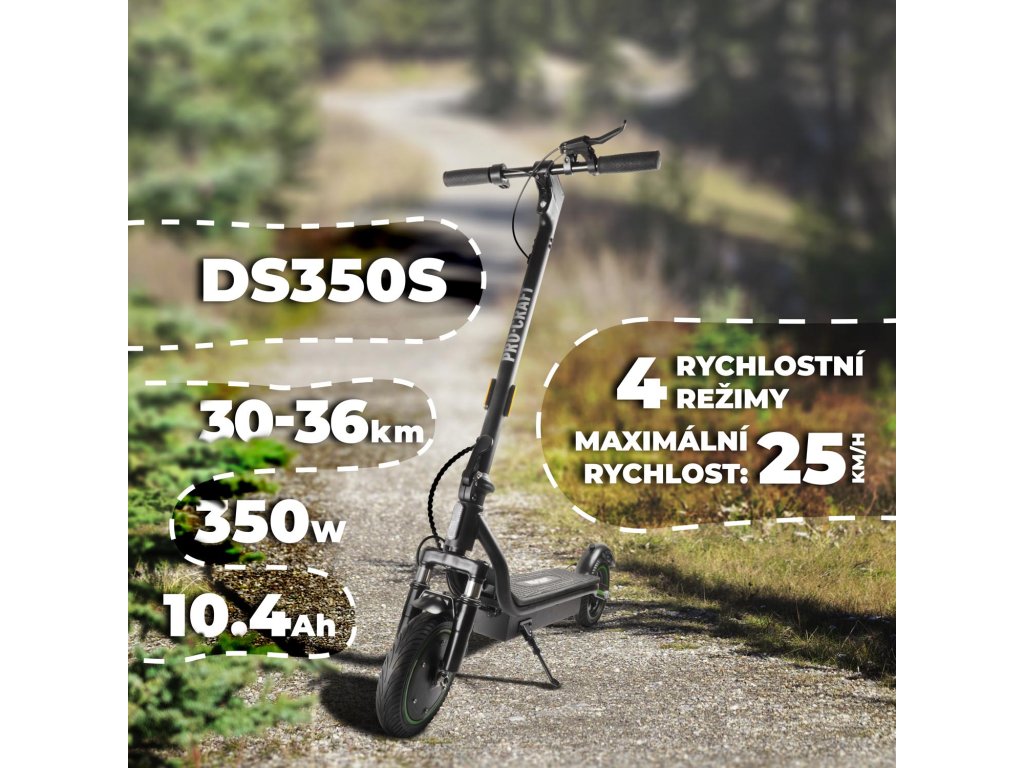 Model DS350S je vybavený výkonným 350W motorom, ktorý dosahuje maximálnu rýchlosť až 25 km/h. K dispozícii sú štyri jazdné režimy (Pedestrian, ECO, Standard, Sport), ktoré umožňujú prispôsobiť rýchlosť aktuálnej situácii. Na bezpečné zastavenie je kolobežka vybavená zadnou kotúčovou brzdou, ktorá poskytuje spoľahlivý a plynulý brzdný účinok.