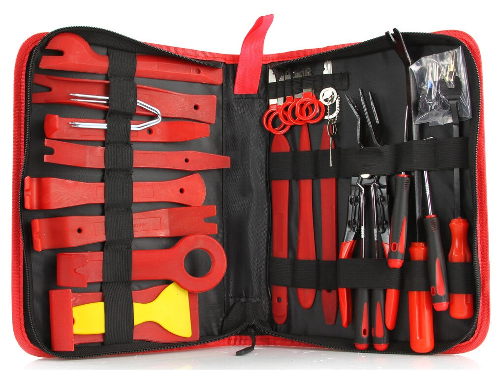 Profesionálna sada na čalúnenia z plastu vystuženého sklenenými vláknami. Ľahko a presne rozoberte ozdobné prvky, svorky, tesniace svorky, vypínače, dverové panely atď. Sadu je možné použiť aj na vytiahnutie taxametra alebo rádia. Odstraňovače vhodné pre väčšinu rádií.