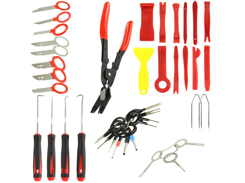 Veľká, univerzálna sada páčidiel a klieští rôznych tvarov pre všetky typy uchytenia čalúnenia interieru vozidla.