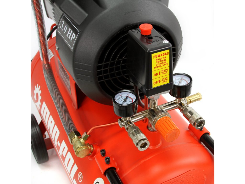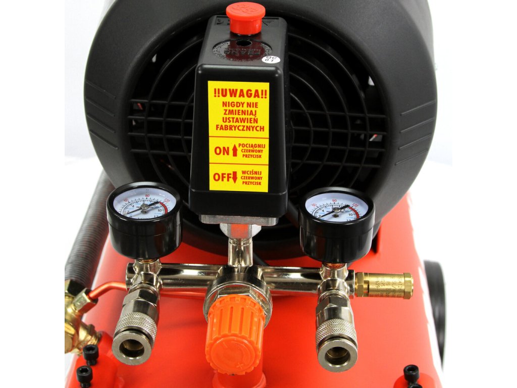 Kompresor má redukčný ventil vybavený dvoma rýchlospojkami a dvoma manometrami. Kompresor sa automaticky vypne, keď dosiahne 8 BAR.