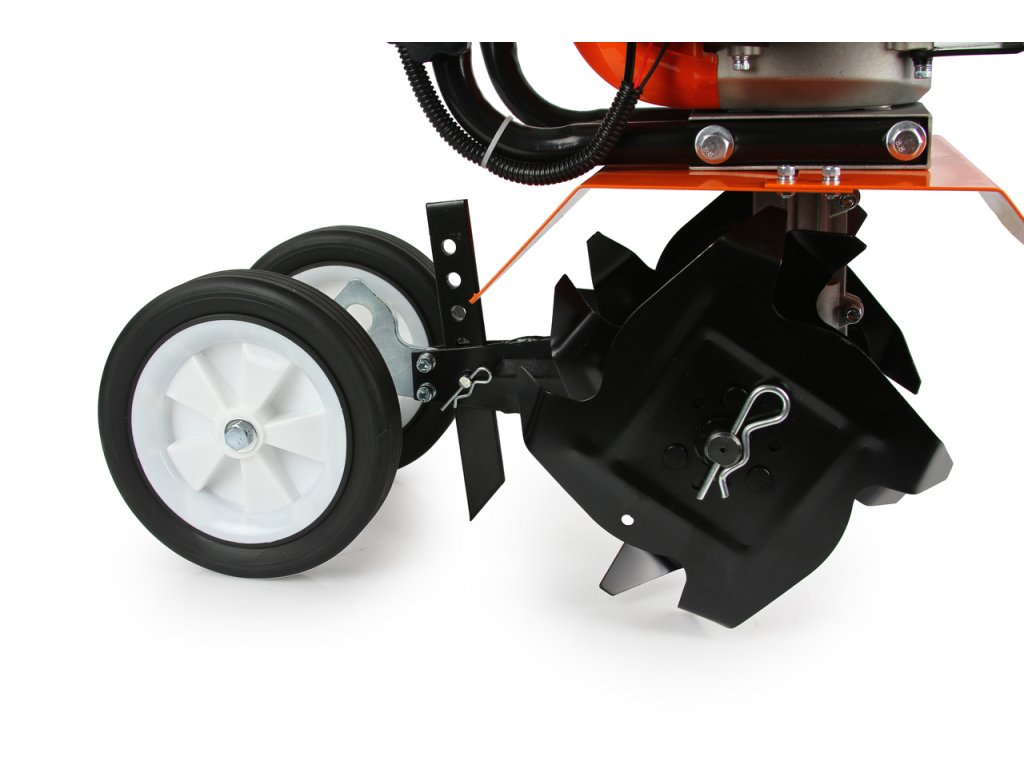 Pracovná hĺbka je 15 cm a dá sa nastaviť nastavením kolies v 3 polohách. To vám umožní nastaviť zariadenie v závislosti od požadovanej hĺbky kyprenia.