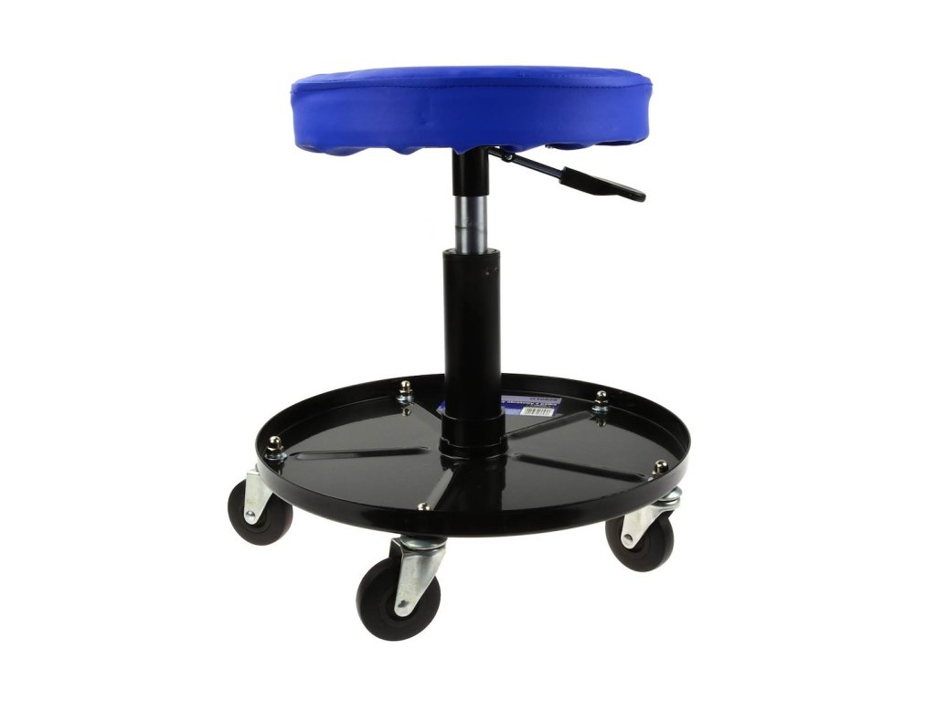 - Dielenská stolička s oceľovou konštrukciou a piatimi otočnými kolieskami (360 °), plne polstrovaným sedadlom a delenou poličkou na náradie.