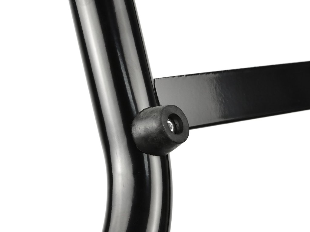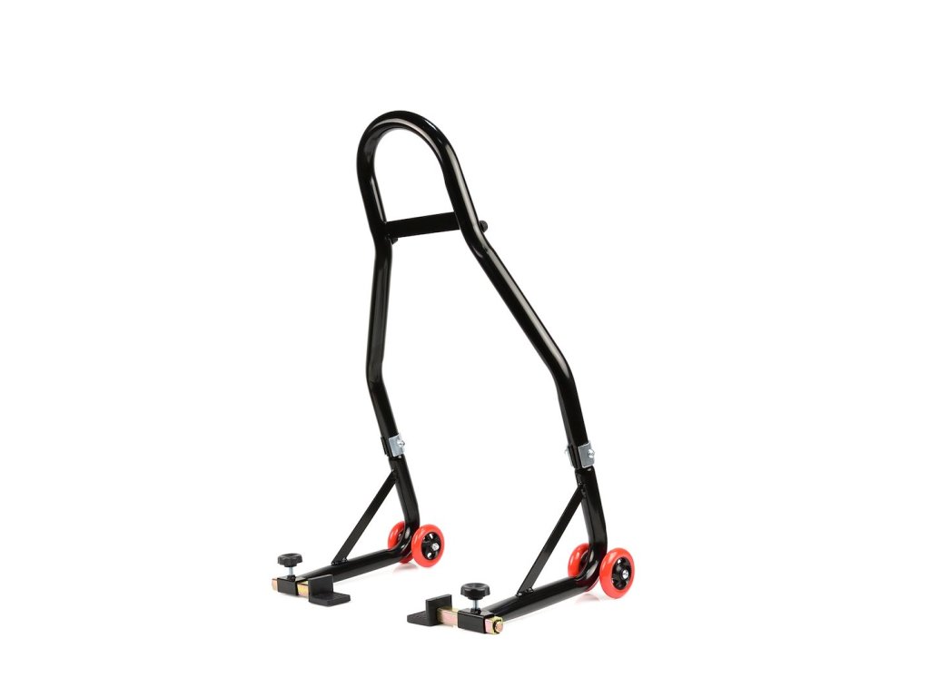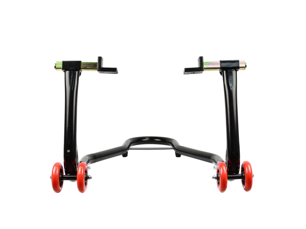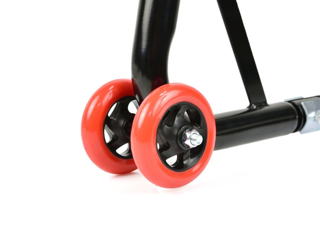 Zosilnený stojan na motorku pod zadné koleso. Na výrobu bola použitá oceľová rúrka s práškovým nástrekom s priemerom 32 mm . Zosilnená konštrukcia stojanu navyše zaručuje stabilné a bezpečné zdvíhanie motorky. Kolesá sú vyrobené z kvalitného ABS plastu.