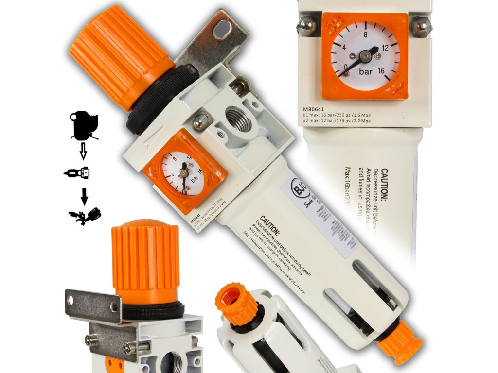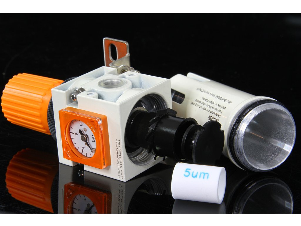 Odkaľovač filtruje a čistí a reguluje stlačený vzduch od oleja, vodného kondenzátu a pevných častíc .