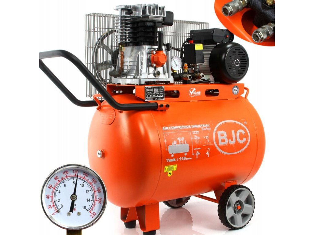 Kompresor BJC 115 L je vybavený kvalitnou výbavou, tesnými rýchlospojkami ( 2 ks a dodatočný voľný vstup pre rýchlospojku priamo vo valci ) a presnými tlakomermi umožňujúcimi sledovanie prevádzkových parametrov kompresora.