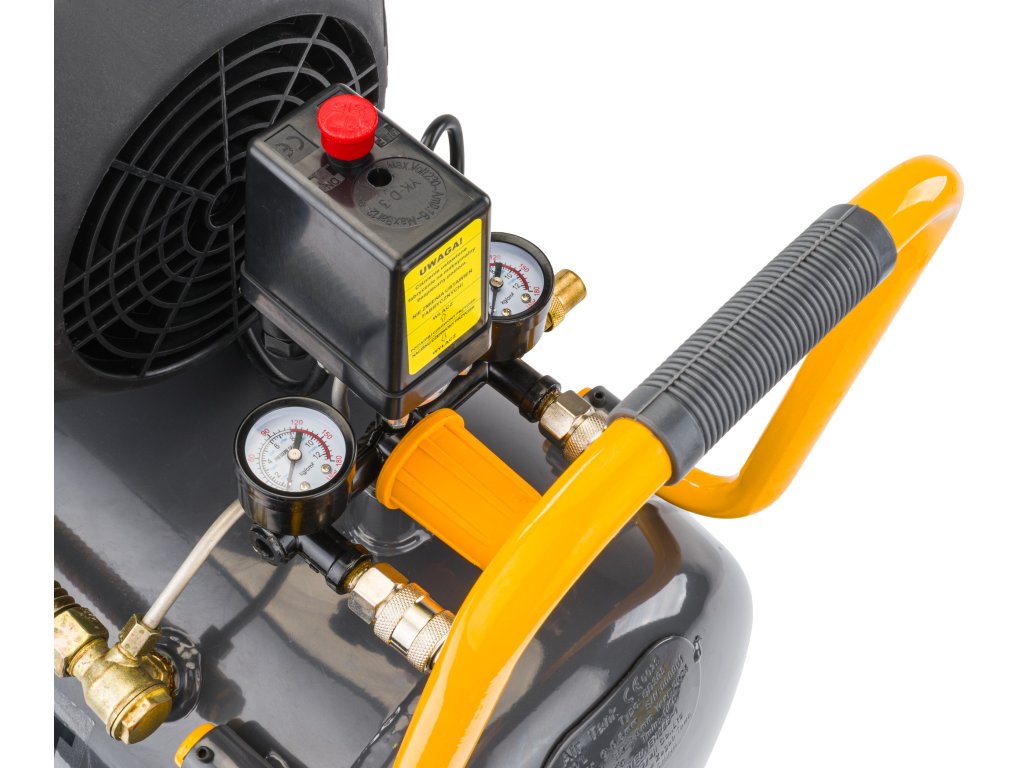 Tlakový spínač je nastavený na maximálny tlak 8 barov, keď tlak v nádobe dosiahne túto hodnotu, kompresor sa vypne a opäť sa zapne, keď tlak v nádobe klesne pod 6 barov.