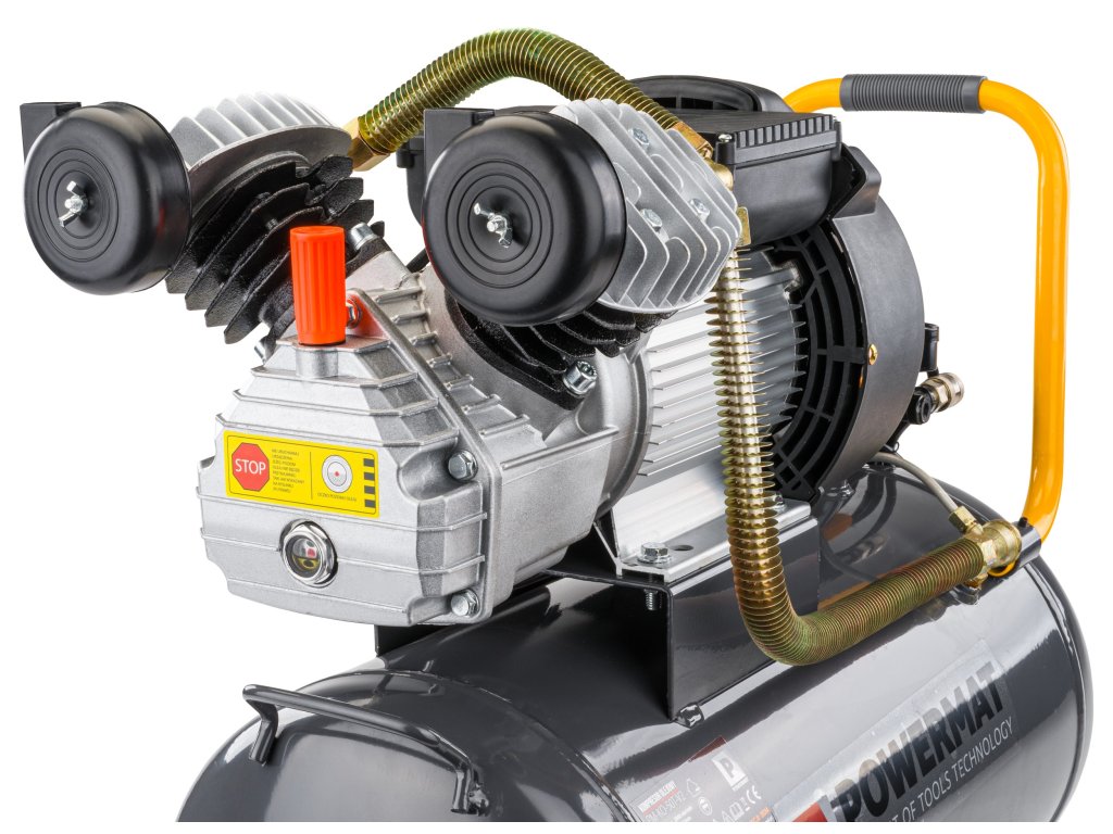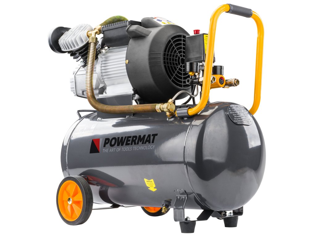 Dvojpiestový 50L kompresor do V poskytuje tlak v nádrži 8 barov a účinný výkon 392 l/min. Kompresor je poháňaný elektromotorom s výkonom 2,2 kW / 3 k.