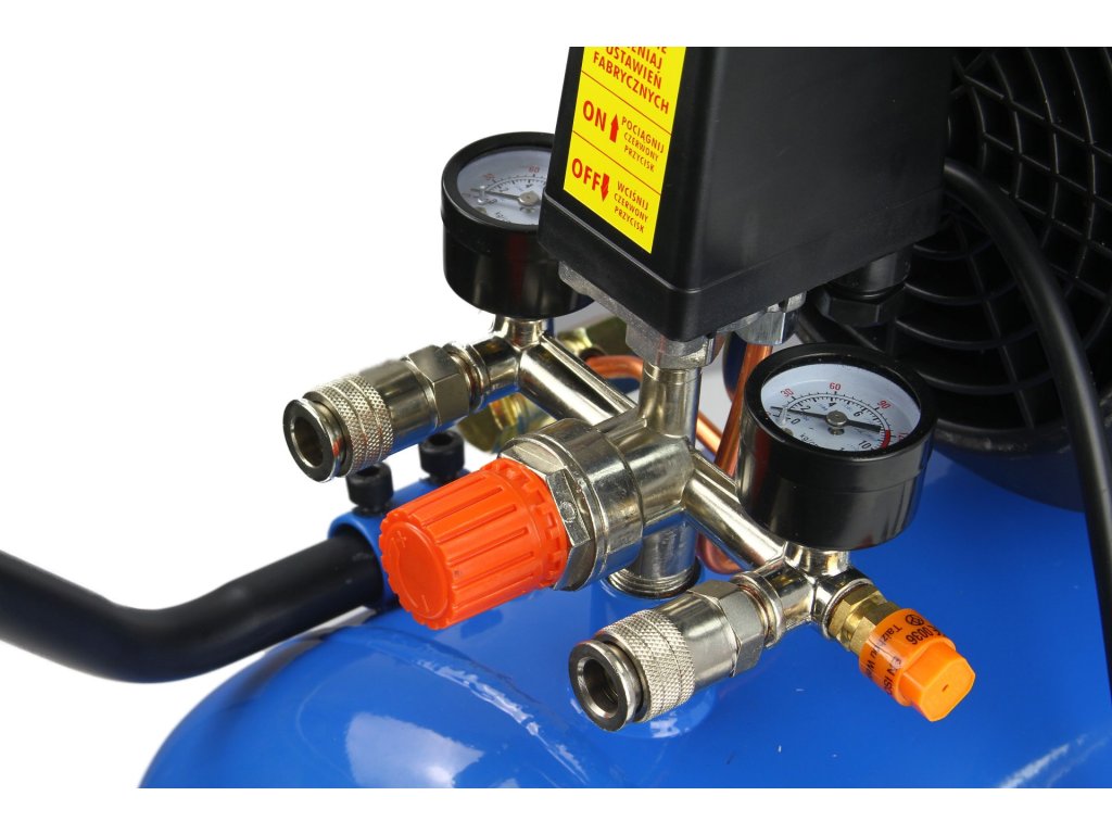 Kompresor má redukčný ventil vybavený dvoma rýchlospojkami a dvoma manometrami. Kompresor sa automaticky vypne, keď dosiahne 8 BAR.