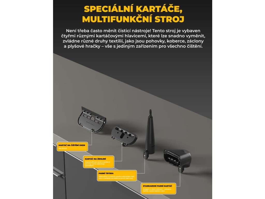 Veľkou výhodou je dotykový displej, ktorý umožňuje jednoduchý výber požadovaného režimu. Môžete si vybrať medzi čistením studenou vodou, horúcou vodou, parou vrátane vysávania alebo parou bez vysávania. Intuitívne ovládanie uľahčuje prácu a prispôsobuje výkon konkrétnej situácii. 4-metrový napájací kábel spolu s 1,2-metrovou sacou hadicou vám umožnia pohodlne dosiahnuť aj tie najvzdialenejšie kúty bez nutnosti neustáleho prepojovania zásuviek.