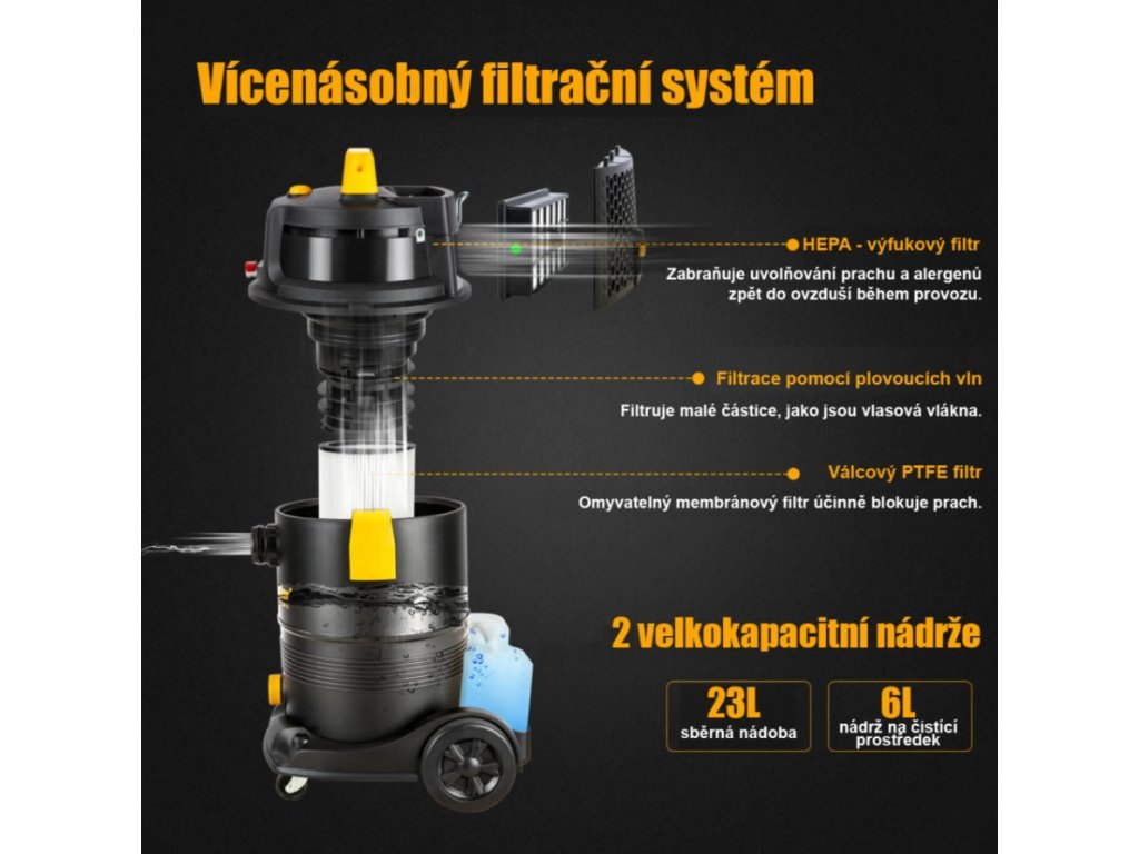 Objemné nádoby: 23 l nádrž na vodu a 6 l nádrž na čistiaci prostriedok umožňujú dlhú prevádzku bez častého dopĺňania.