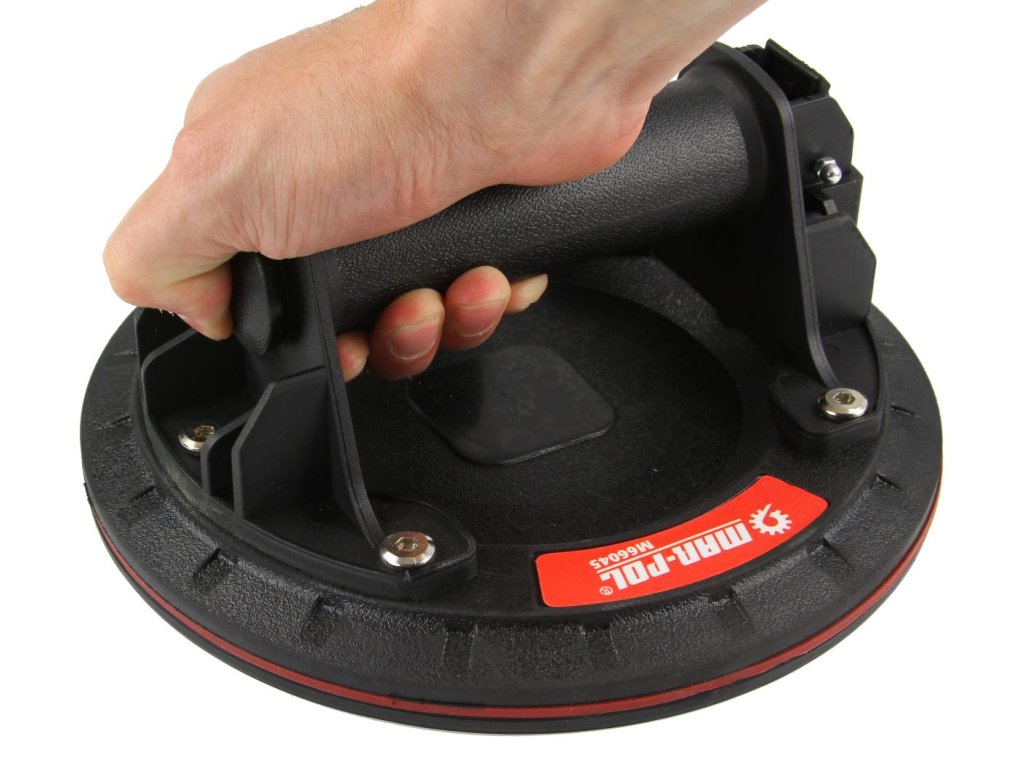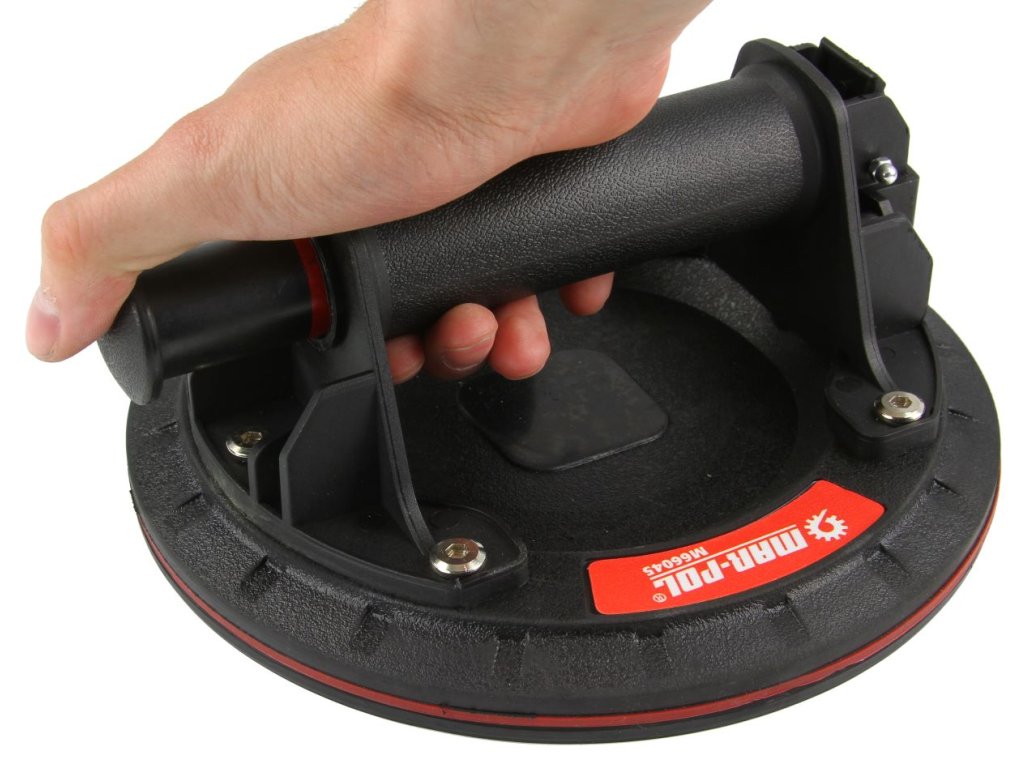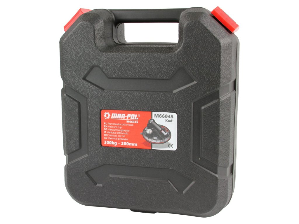 Prísavka využíva gumu s pracovným priemerom do 200 mm. Každá rukoväť má navyše plastový kryt a veľmi pevný transportný box.