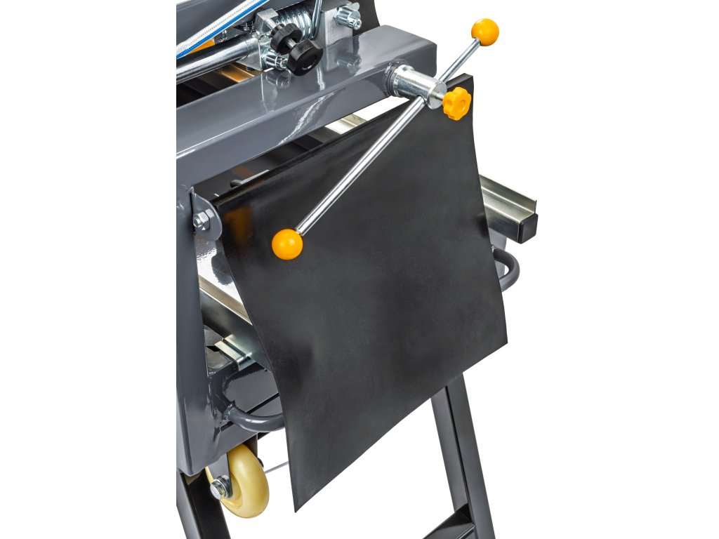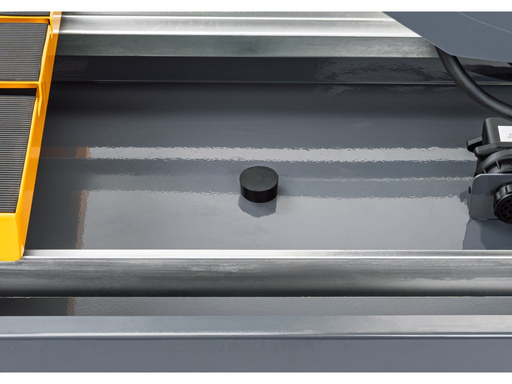 Robustný valčekový vozík zabezpečuje plynulé vedenie materiálu a zabudované pravítko uľahčuje nastavenie presných rozmerov.