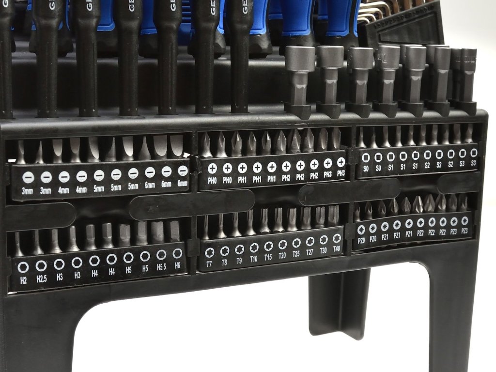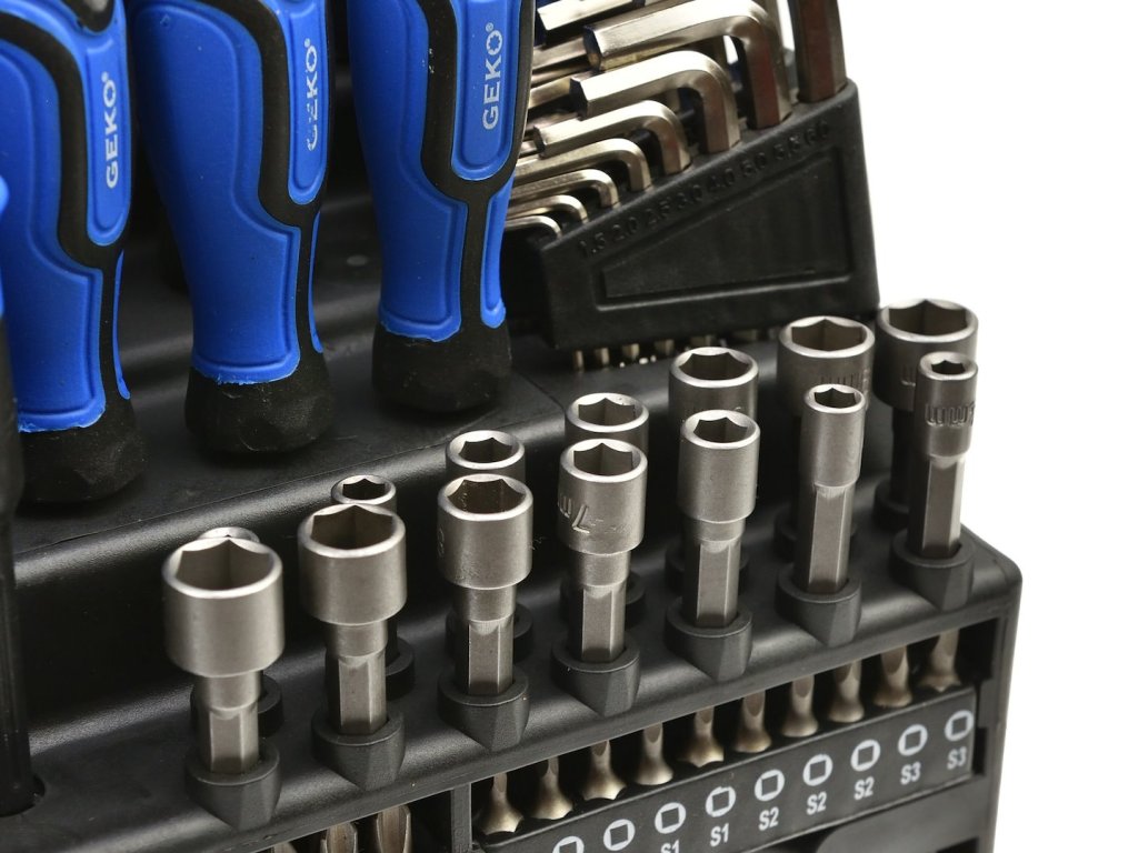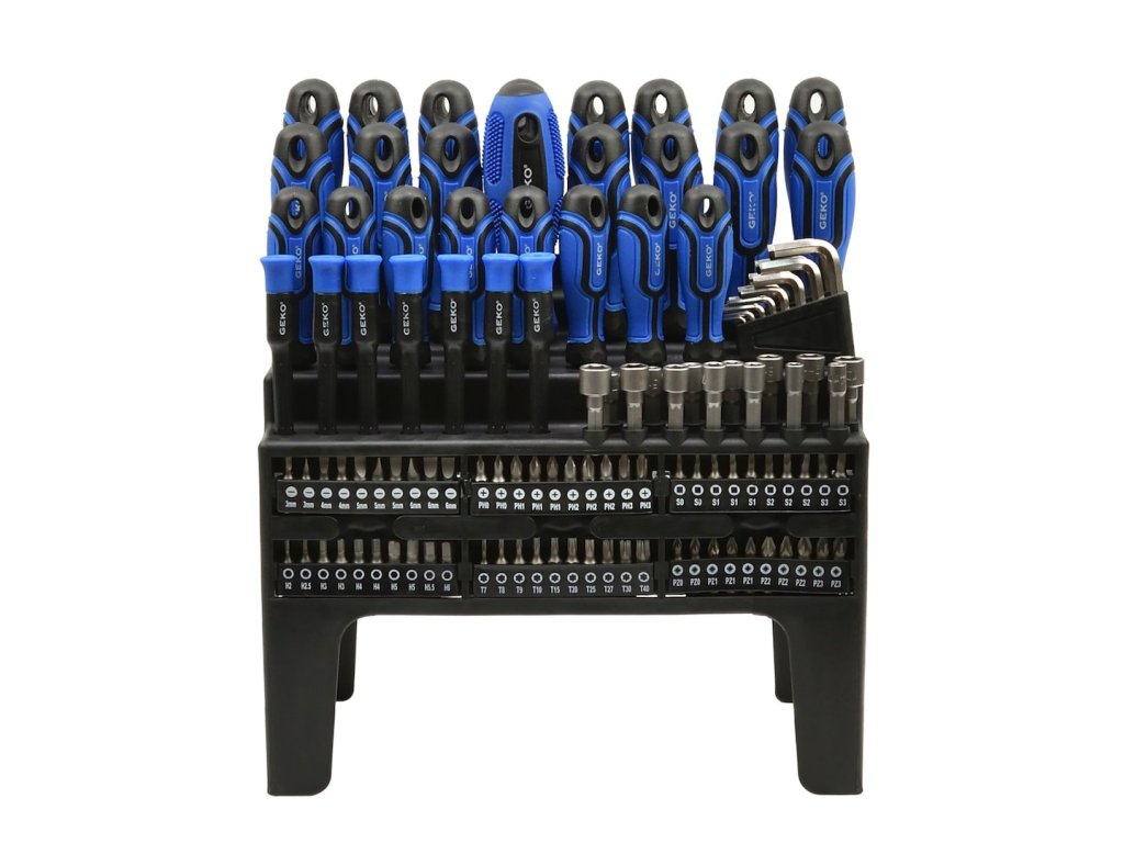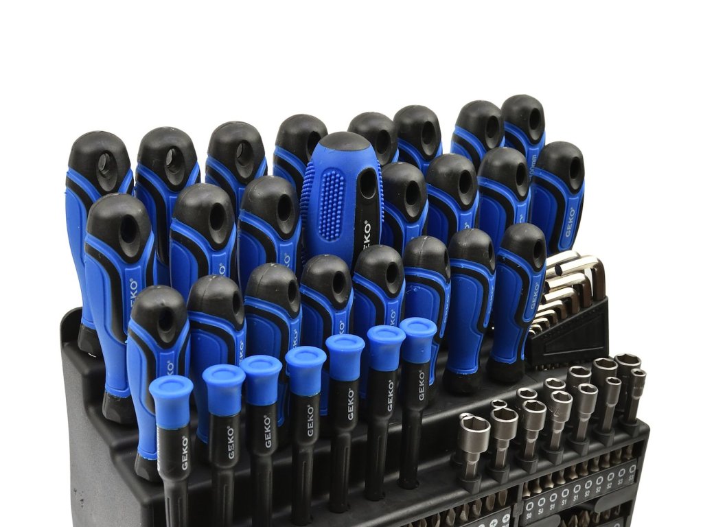 Sada 122 skrutkovačov renomovanej značky GEKO, vyrobená z chróm-vanádiovej ocele (CrV).