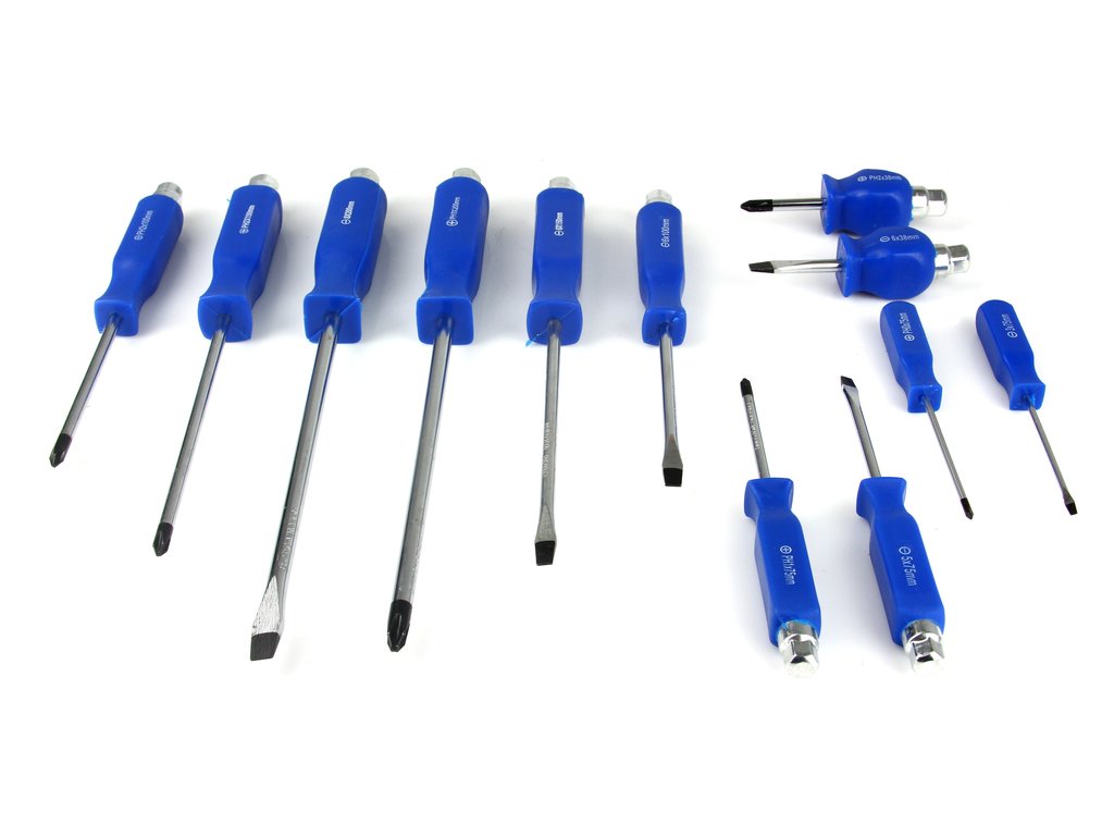 Veľká sada 12-tich úderových skrutkovačov. Každý skrutkovač obsahuje jadro, ktoré prechádza skrz rukoväť a na konci má plochu na udieranie kladivom.