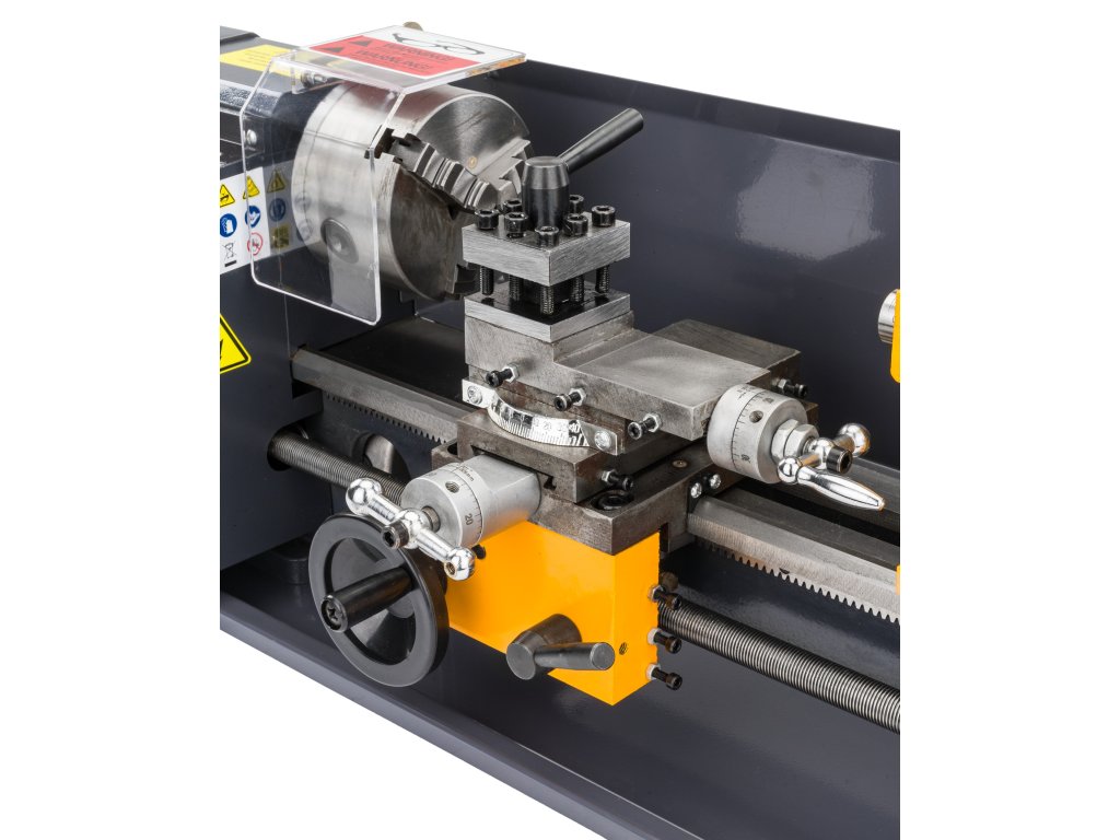 Mini stolový sústruh je ideálny na precízne opracovanie malých dielov, vhodný pre hobby aj profesionálnu dielňu. Sústruh so systémom rýchlej výmeny nástrojov umožňuje bleskurýchle prechody medzi vnútorným rezaním, čelným rezaním a úkosovaním vďaka nastaviteľnému uhlu čepele nástroja. Profesionálne krížové vedenie odolné voči oderu umožňuje plynulý pohyb čepelí pomocou podávacej tyče, čo zaisťuje maximálnu presnosť a efektivitu.