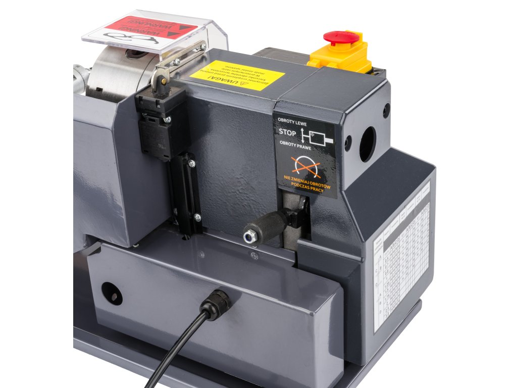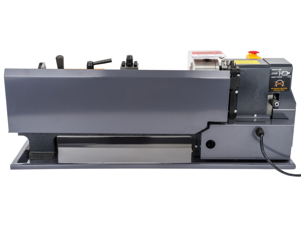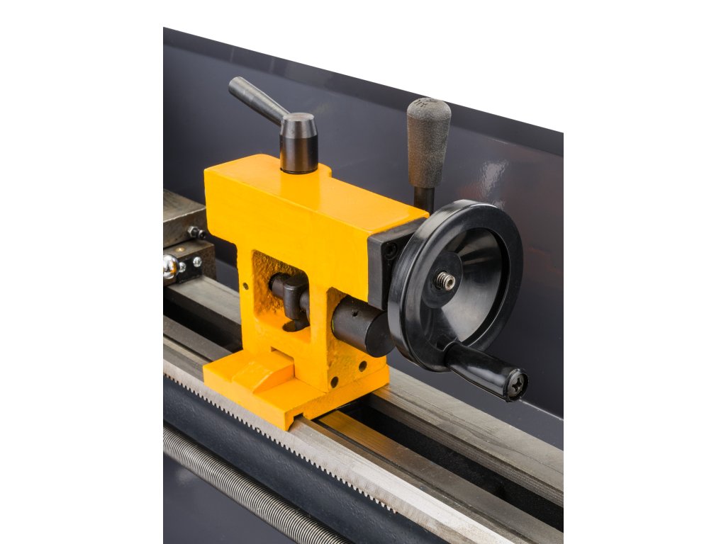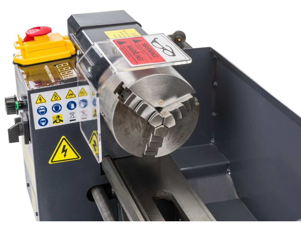 Vreteno pracuje pri otáčkach od 0 do 2250 ot/min, dopredu aj dozadu, pri akejkoľvek úrovni otáčok! Možnosť pracovať ručne alebo s automatickým, nastaviteľným posuvom. Pevnosť a presnosť klzných vedení zabezpečujú tepelne kalené a brúsené komponenty. A pre úplnú ochranu - núdzové tlačidlo STOP je súčasťou dodávky.