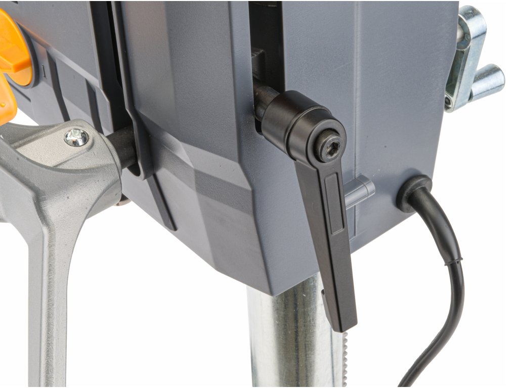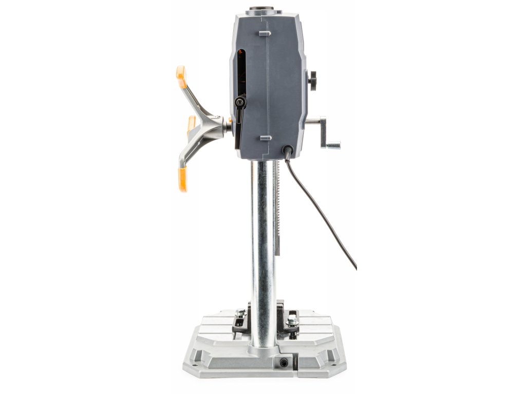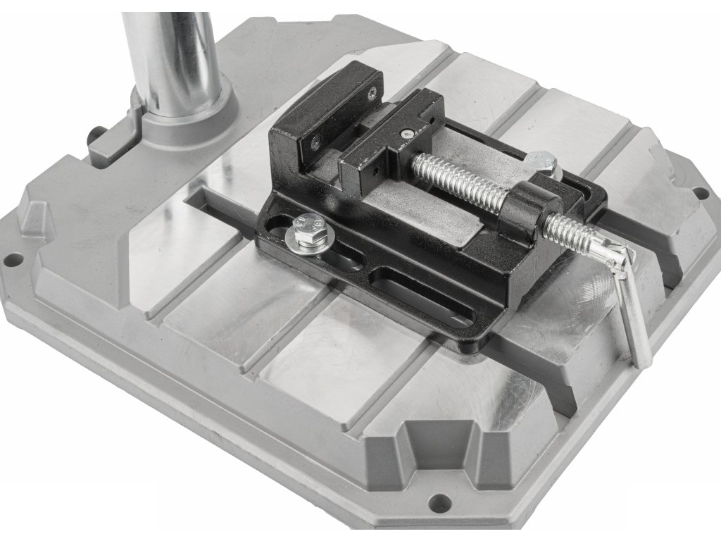 Vŕtačka má stabilný, pevný a nastaviteľný pracovný stôl a strojový zverák.