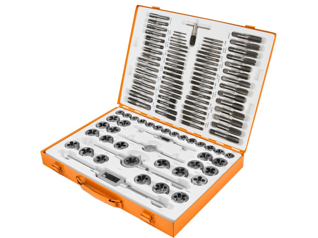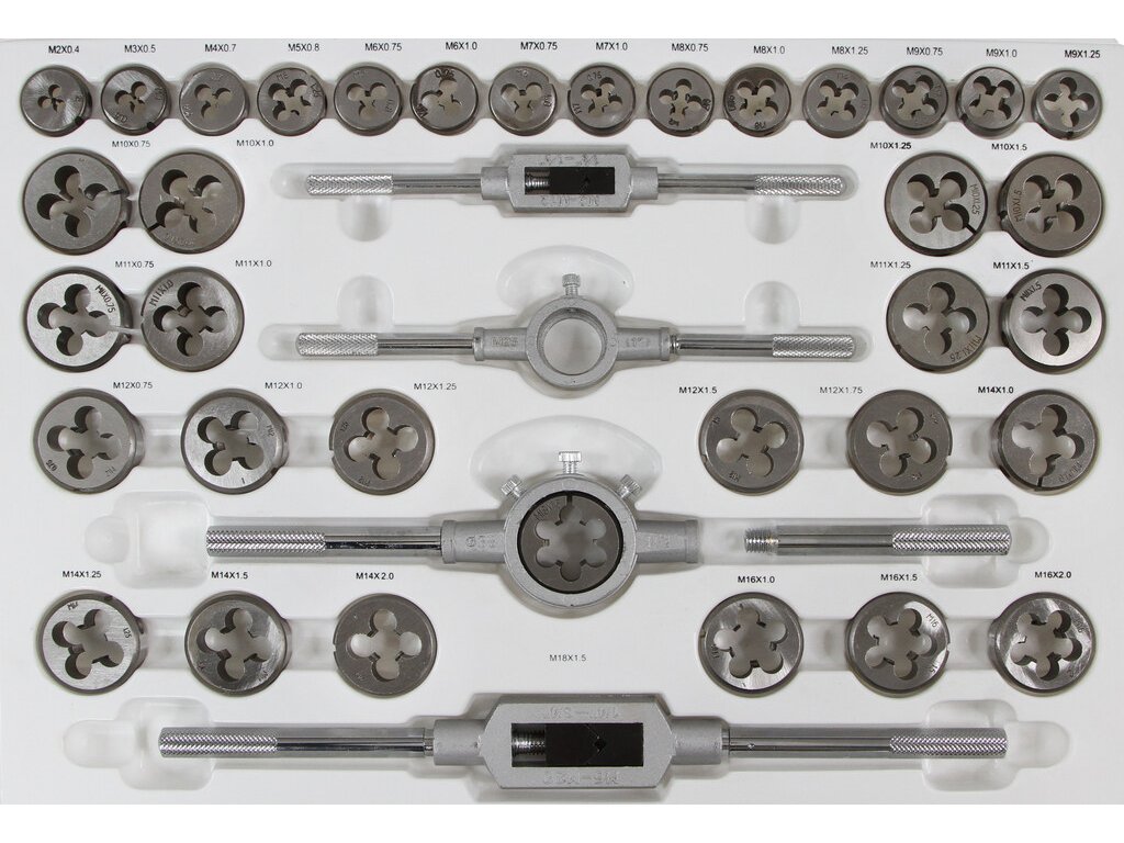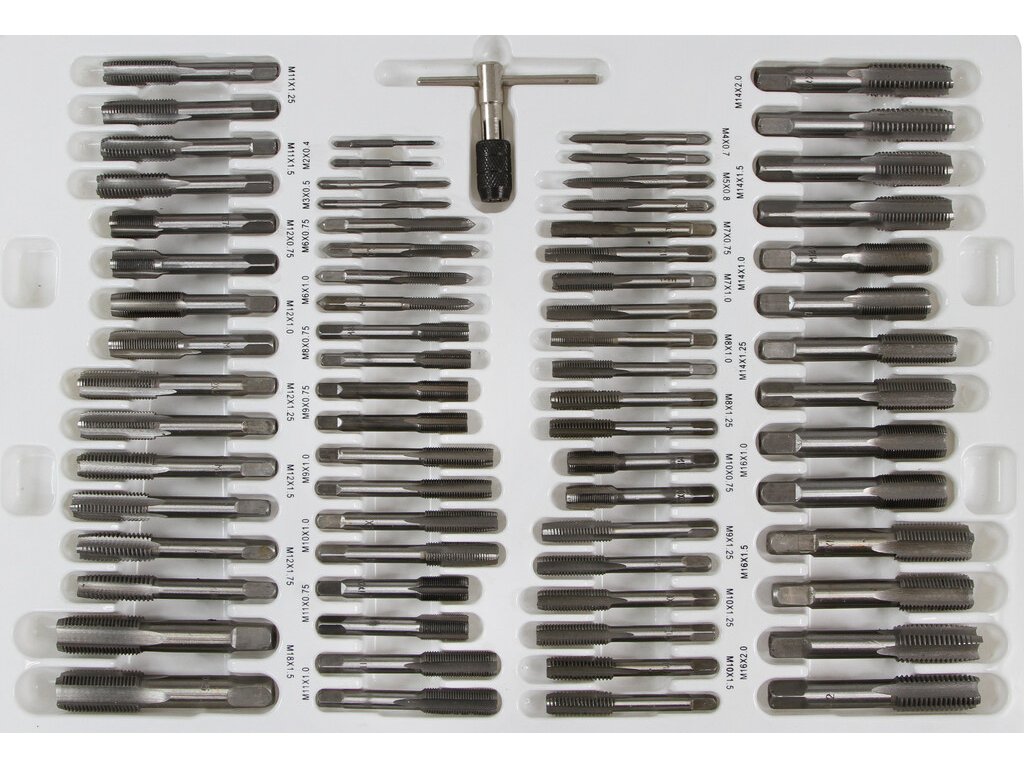 Obsahuje dva metricke závitníky od každého rozmeru, prvý závitník s jemnejším nábehom a druhý na finálne dokončenie závitu aj v zaslepenej diere, plechový kufor.