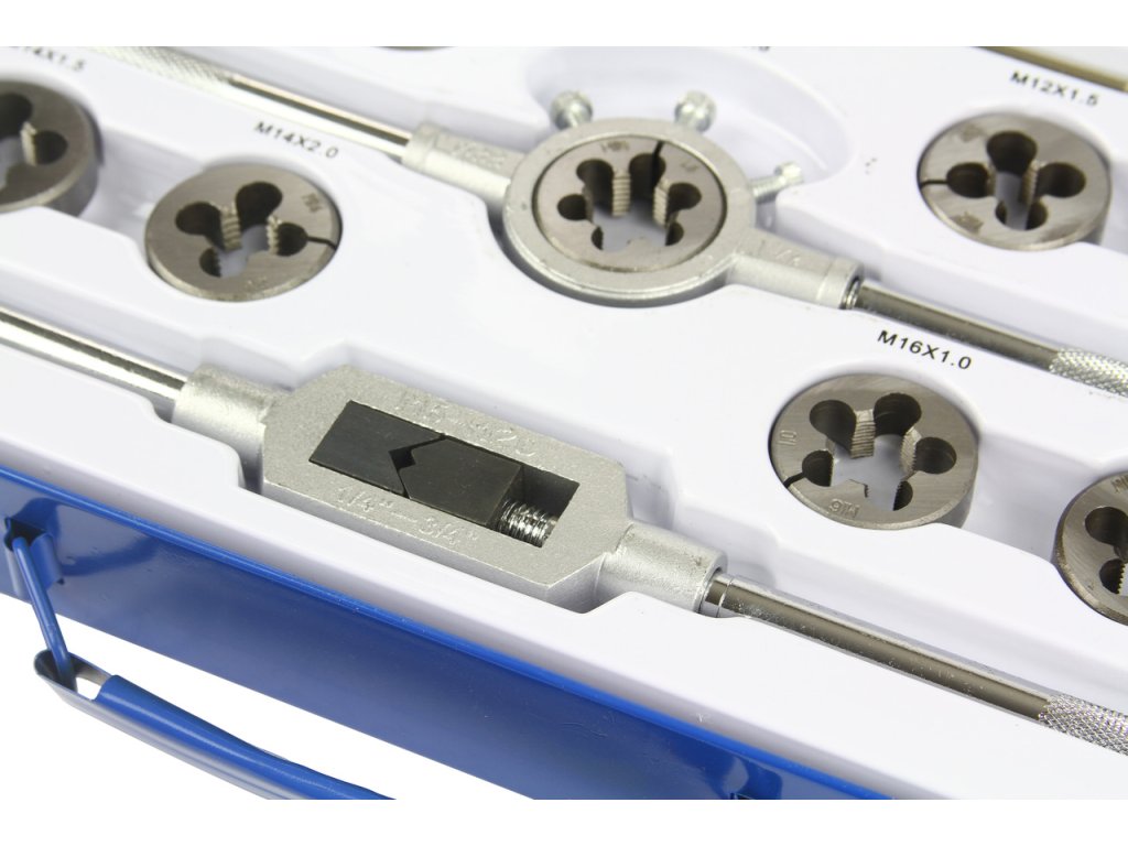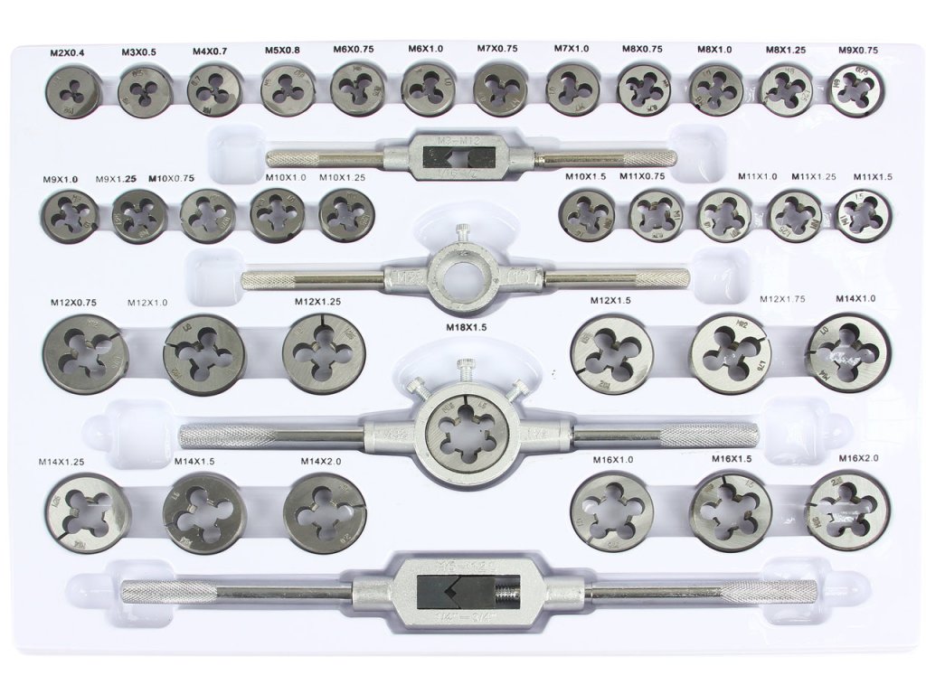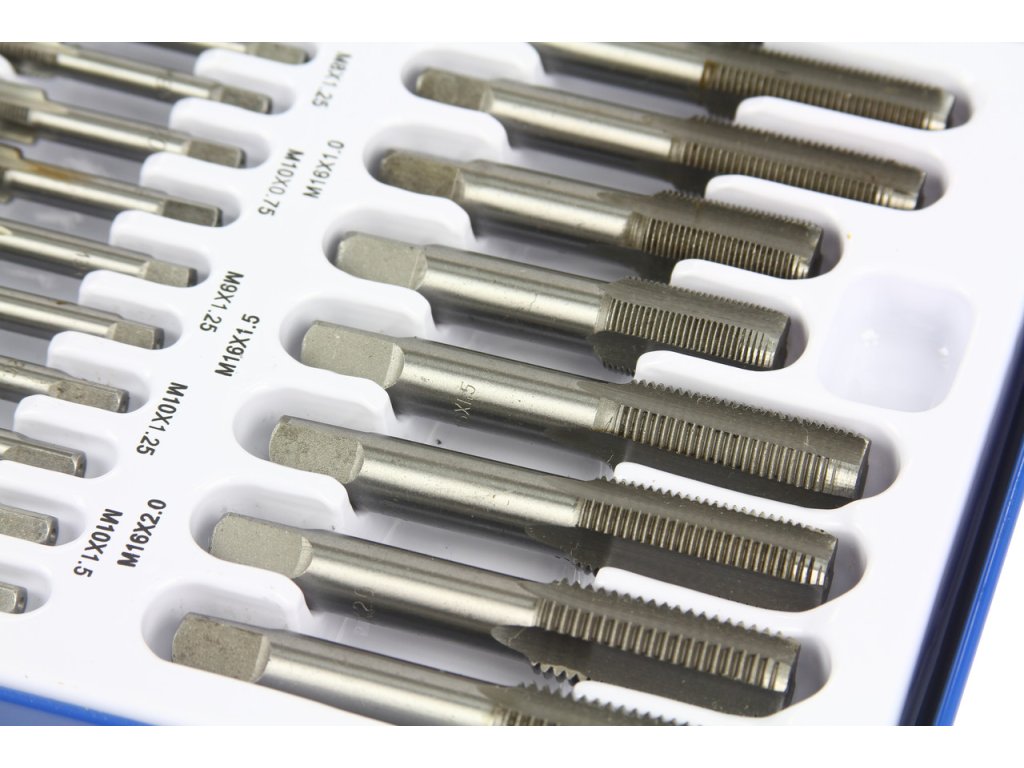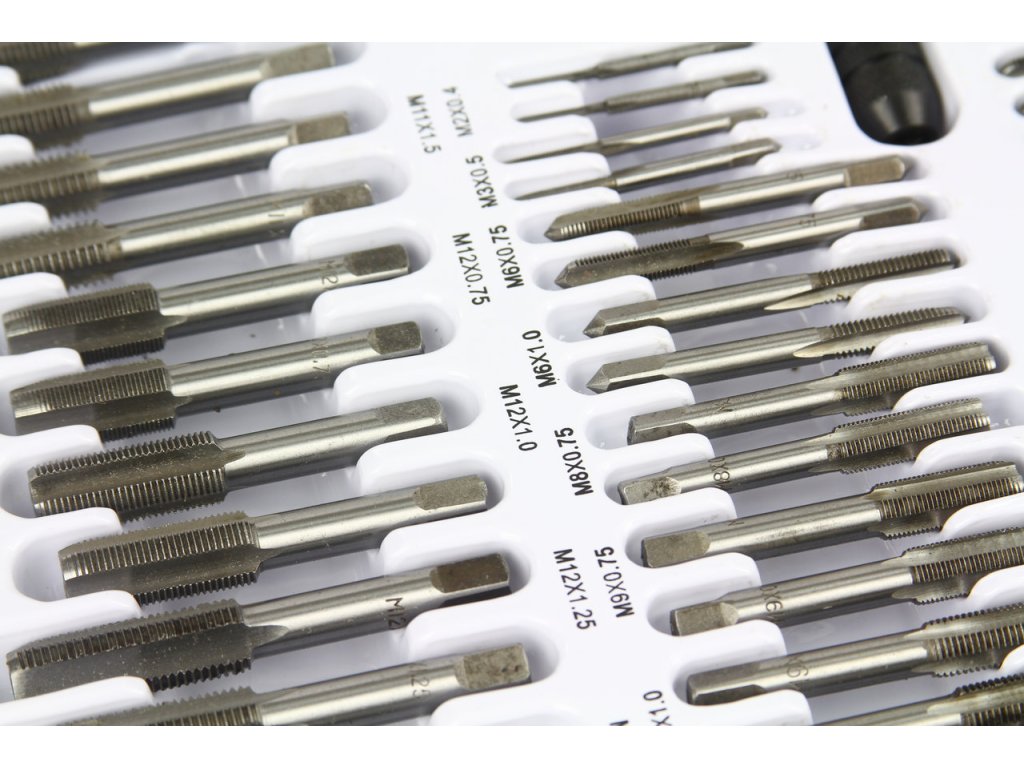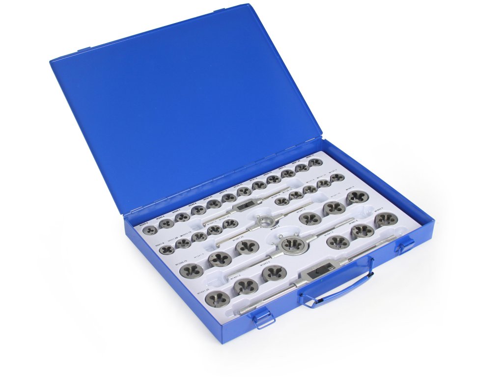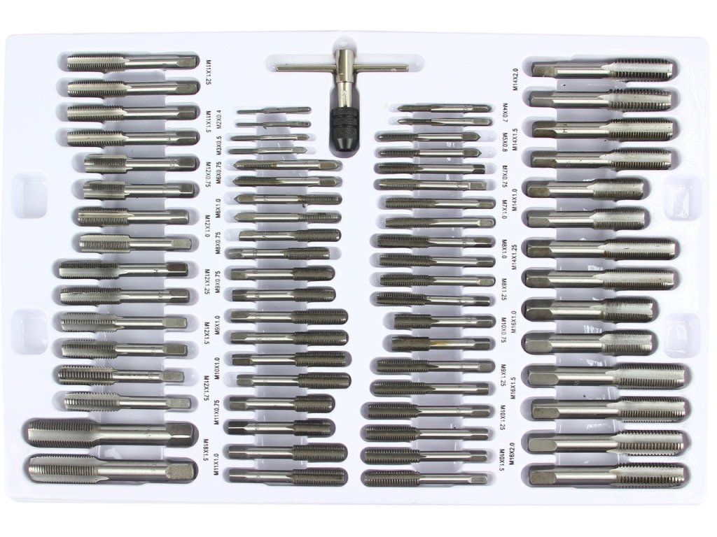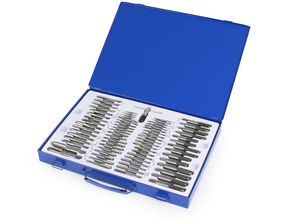Obsahuje dva metricke závitníky od každého rozmeru, prvý závitník s jemnejším nábehom a druhý na finálne dokončenie závitu aj v zaslepenej diere, plechový kufor.