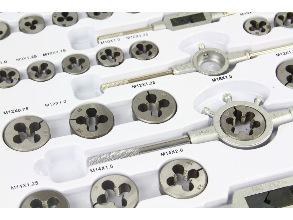 Sada 110 ks metrických závitníkov a závitových očiek z nástrojovej ocele pre ručné závitovanie pomocou vratidla.