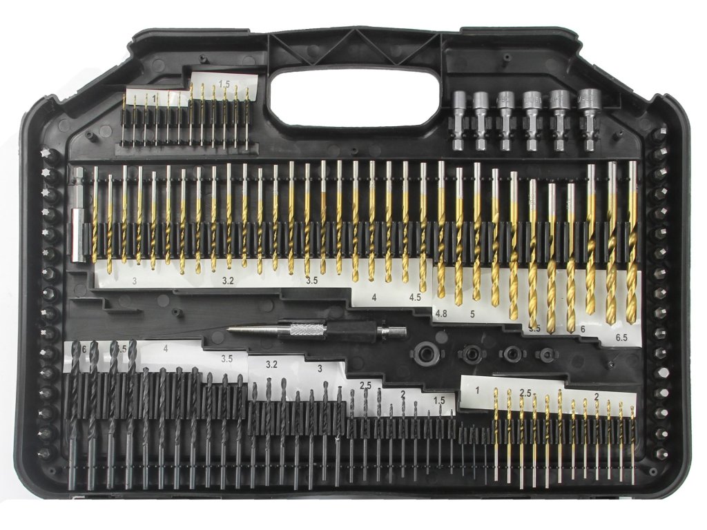 - HSS vrtáky: 1 mm x 6; 1,5 mm x 6; 2,0 mm x 6; 2,5 mm x 6; 3 mm x 7; 3,2 mm x 6; 3,5 mm x 4; 4 mm x 4; 4,5 mm x 1; 4,8 mm x 1; 5 mm x 4; 5,5 mm x 2; 6 mm x 2; 6,5 mm x 2