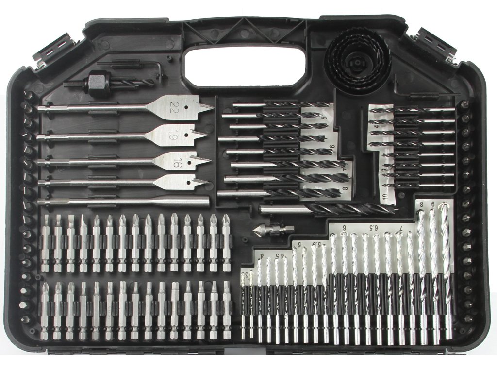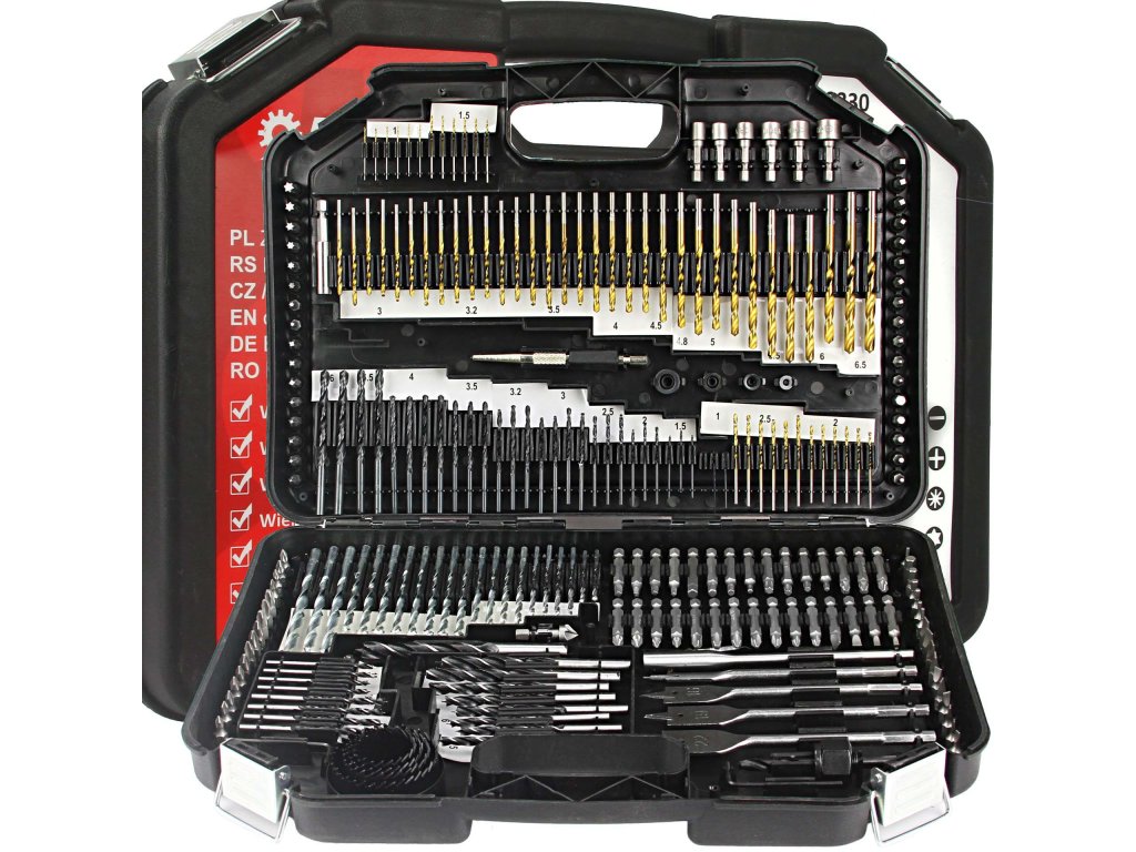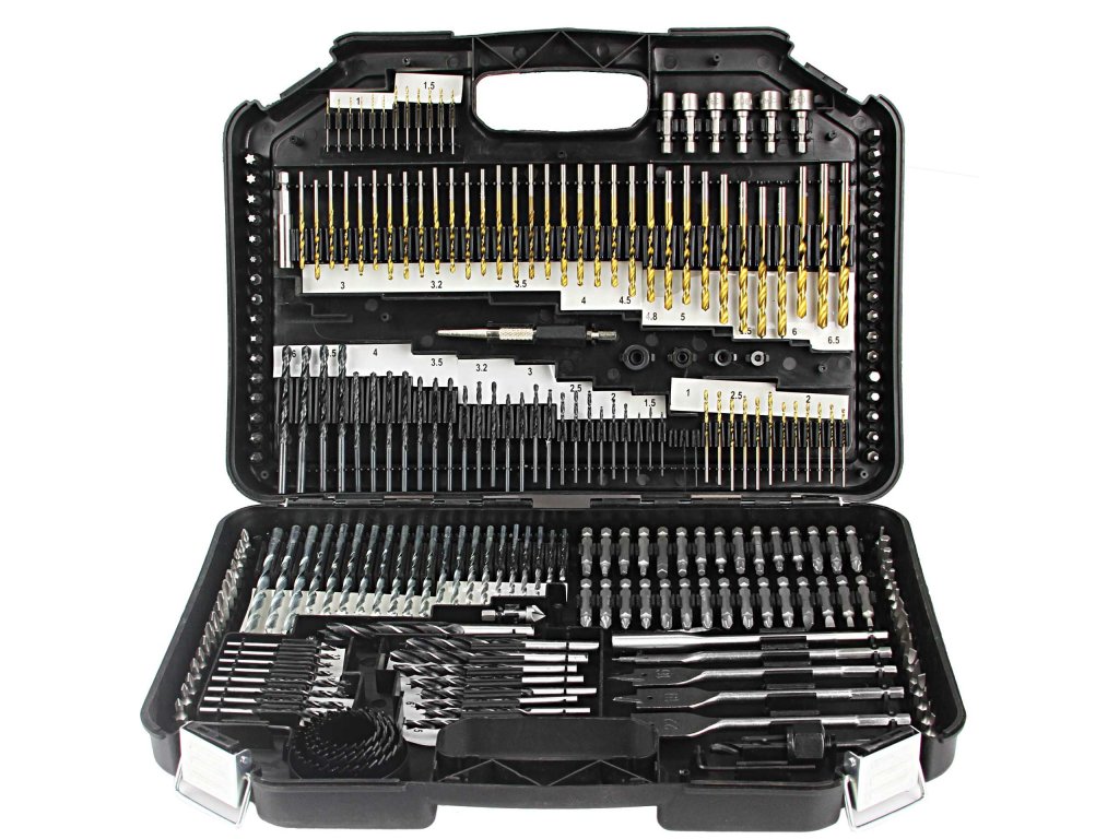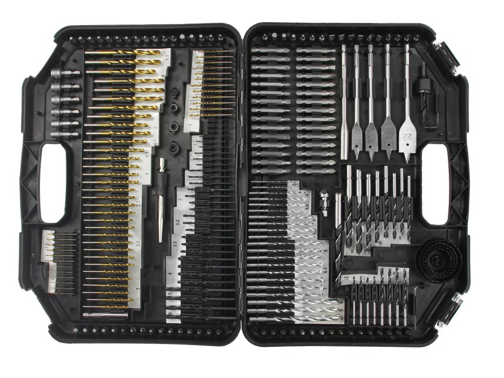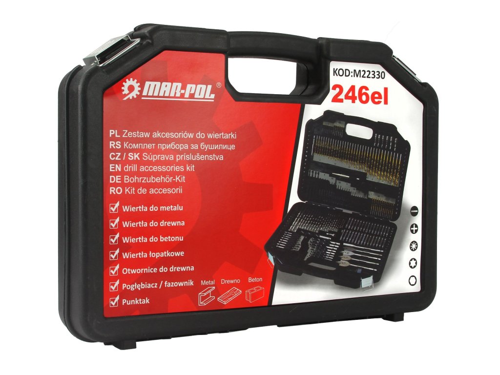 Sada príslušenstva pozostávajúca zo všetkých 246 praktických prvkov vám umožní vykonávať rôzne práce. Sada obsahuje vrtáky do dreva, vrtáky do kovu, vrtáky do betónu, bity, perové vrtáky, dierovky, bity, imbusové nástrčky, záhlbník, imbusový kľúč, adaptéry. Všetko bolo umiestnené v pevnom kufri, vďaka čomu vám uskladnenie a preprava tak veľkého setu nespôsobí problémy. Každému doplnku je v kufri pridelené konkrétne miesto, čo uľahčuje jeho udržiavanie v poriadku. Vyrobené z rýchloreznej ocele HSS.