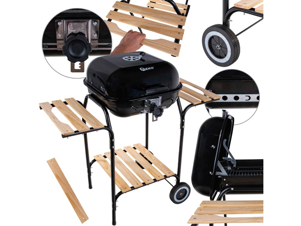 Gril na drevené uhlie GEKO ponúka praktické funkcie, ako sú bočné police a nastaviteľná výška grilu, čo uľahčuje grilovanie. So svojou pevnou konštrukciou a funkčnými prvkami je pohodlnou a odolnou voľbou pre každú príležitosť.