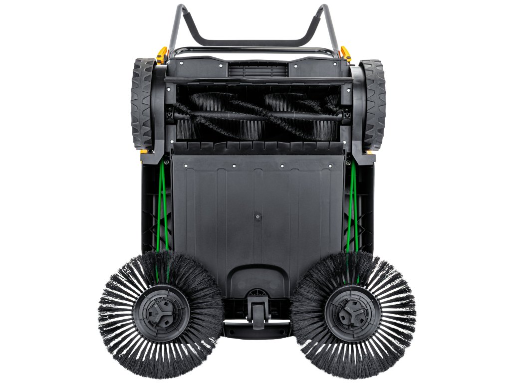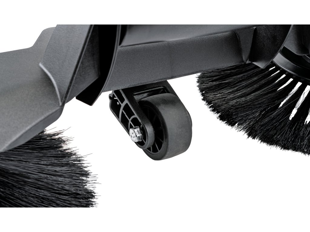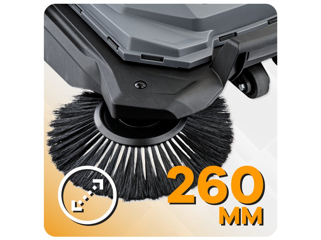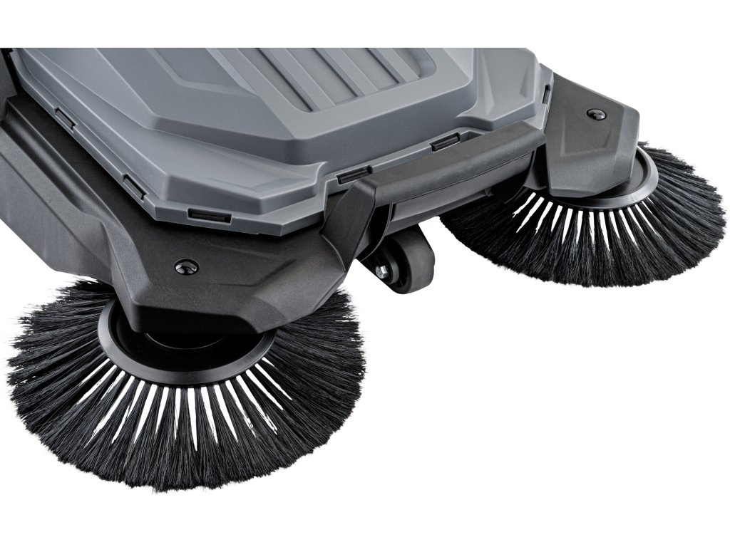Model je vybavený dvoma bočnými kefami s priemerom 260 mm, ktoré zväčšujú pracovnú šírku na 650 mm. Má pracovný výkon až 1 800 m² za hodinu, čo z neho robí mimoriadne účinný čistiaci nástroj. Dlhý dosah kief umožňuje rýchle zbieranie nečistôt a ich pružné štetiny sa prispôsobia nerovným povrchom, čím zabezpečia dôkladné zametanie dlaždíc aj dlažby.