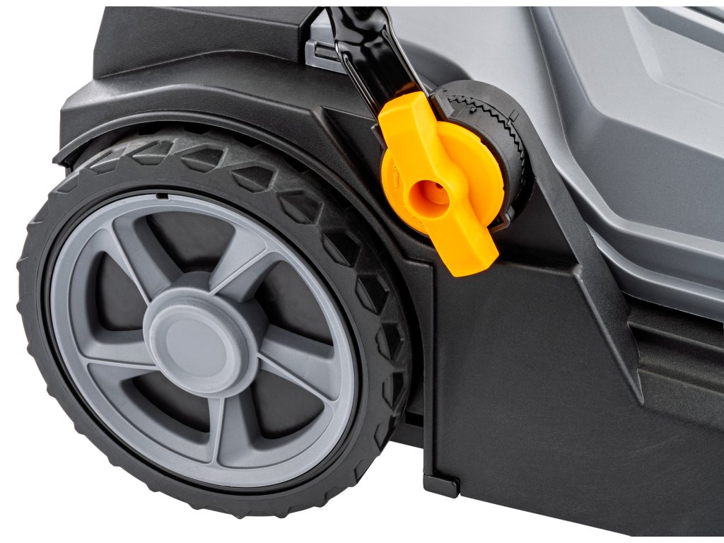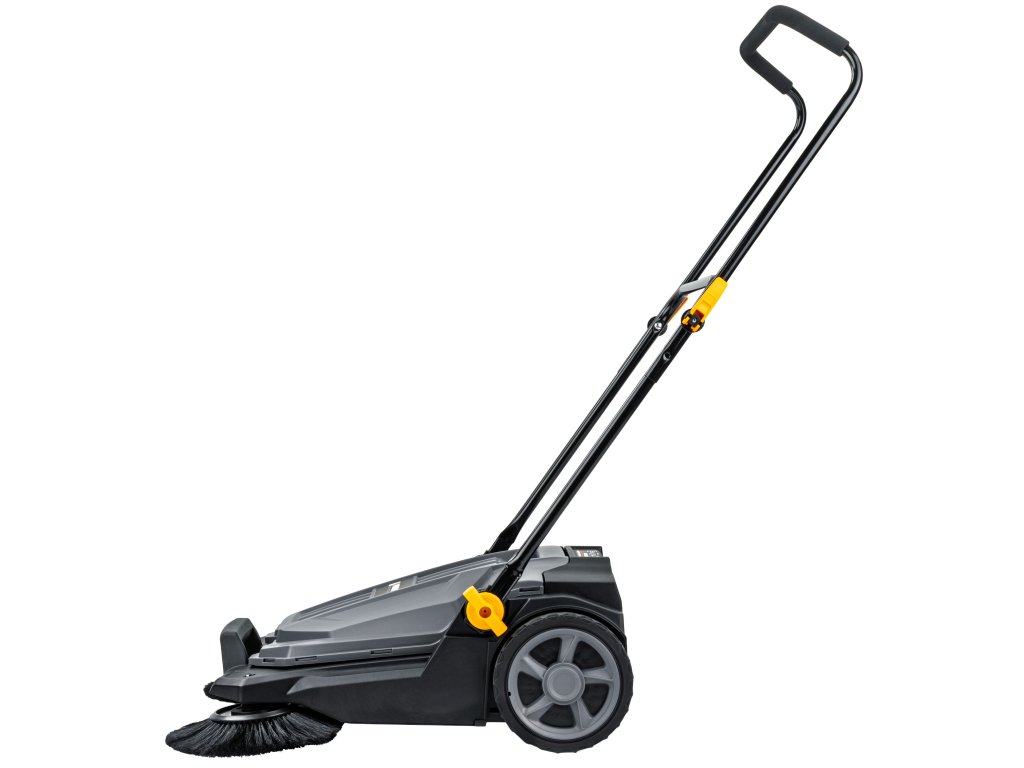 Veľké pogumované kolesá a predné otočné koleso zaručujú hladkú manipuláciu a stabilitu na rôznych typoch povrchu. Zametací stroj funguje dobre na vnútorných aj vonkajších povrchoch. Praktická prepravná rukoväť umožňuje rýchle premiestňovanie zametacieho stroja. Kompaktný dizajn tiež uľahčuje uskladnenie zariadenia po práci.