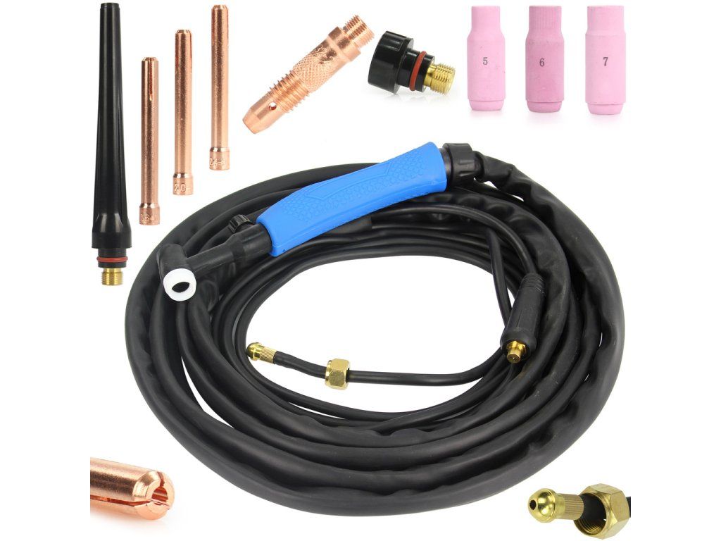 Zvárací horák TIG s pripojením 10-25 a dĺžkou cca 4 metre. Plynová hadica dlhá cca 6 m umožňujúca jednoduché pripojenie fľaše mimo zváracieho stroja, čo je dôležité pre bezpečnosť. Priemer matice na pripojenie k fľaši je 19mm. Univerzálna, robustná rukoväť / zvárací horák WP-17-V TIG LIFT s ventilom. Umožňuje zváranie TIG (v argónovej ochrannej atmosfére) po pripojení k bežnej invertorovej MMA zváračke (pre obaľované elektródy). Dĺžka kábla 4m, dostatočne hrubý napájací kábel, ktorý je prispôsobený na prácu na vyšších prúdoch, dlhší pracovný čas, menej sa zahrieva. Univerzálny, pevný zvárací horák / horák s ventilom typ WP-17-V, alebo pod iným názvom SR17V s pripojením LW 10-25 sa hodí pre väčšinu zváracích zariadení dostupných na trhu. Po pripojení tohto horáka na multifunkčné zváracie zariadenie typu: MIG + MMA + TIG LIFT môžete zvárať metódou TIG. Túto možnosť poskytuje použitie plynového ventilu v rukoväti. Ergonomická rukoväť zaisťuje vysoký komfort práce. Rukoväť má kvalitný gumený kryt, ktorý chráni káble proti oderu.