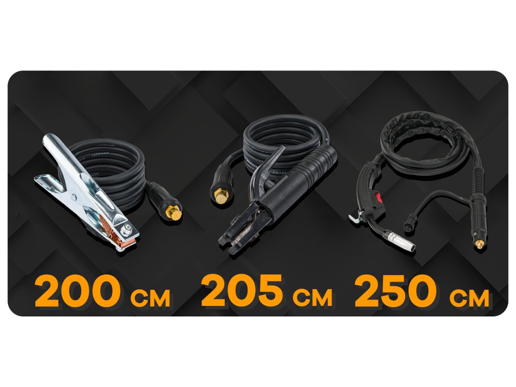 - Držiak elektród MMA (+): 205 cm / 9 mm priemer zástrčky 12-25