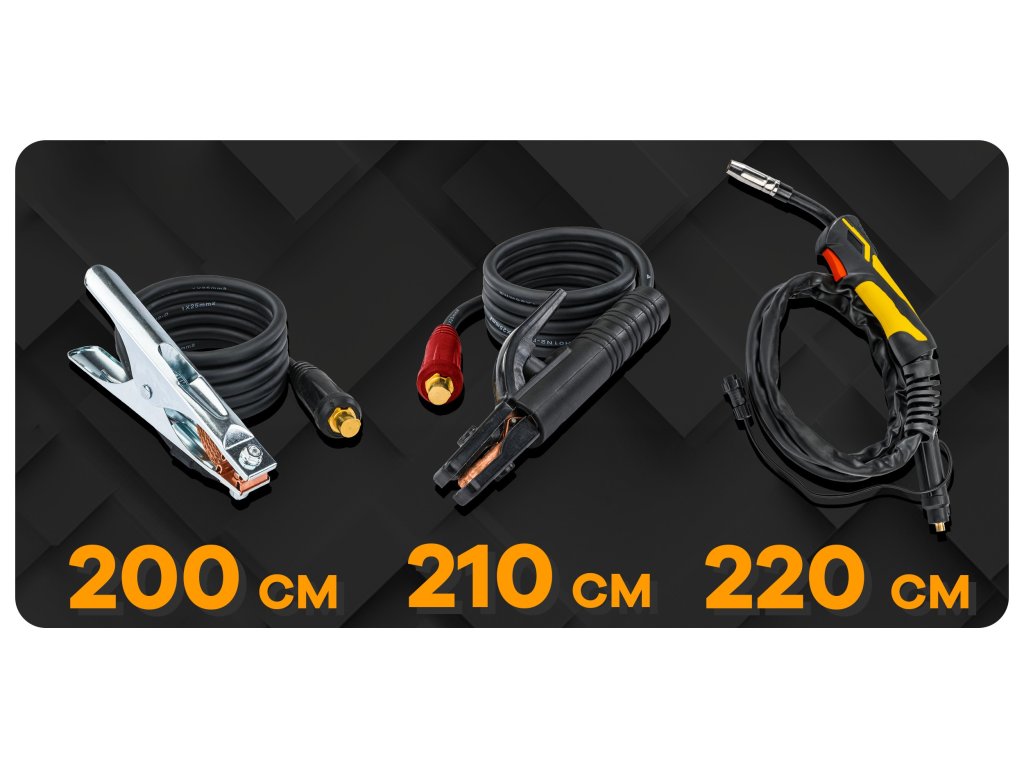- Držiak elektród MMA (+): 210 cm / 9 mm priemer zástrčky 16-25